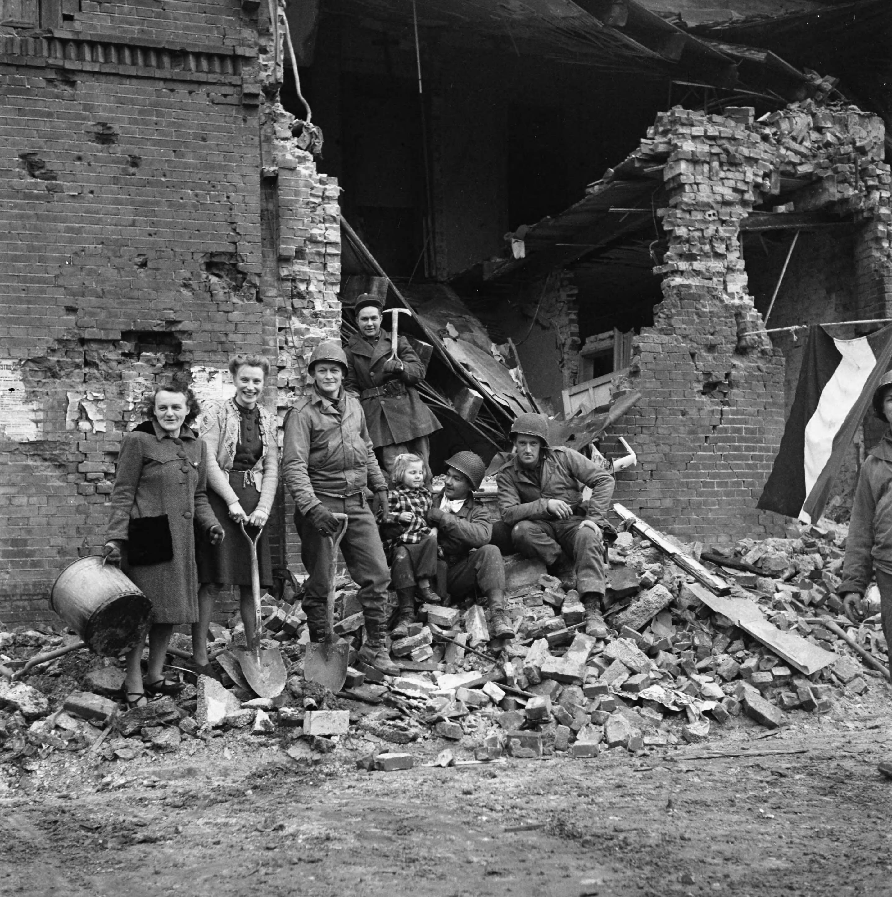 Amerikaanse militairen en burgers voor een vernielde woning in Venlo