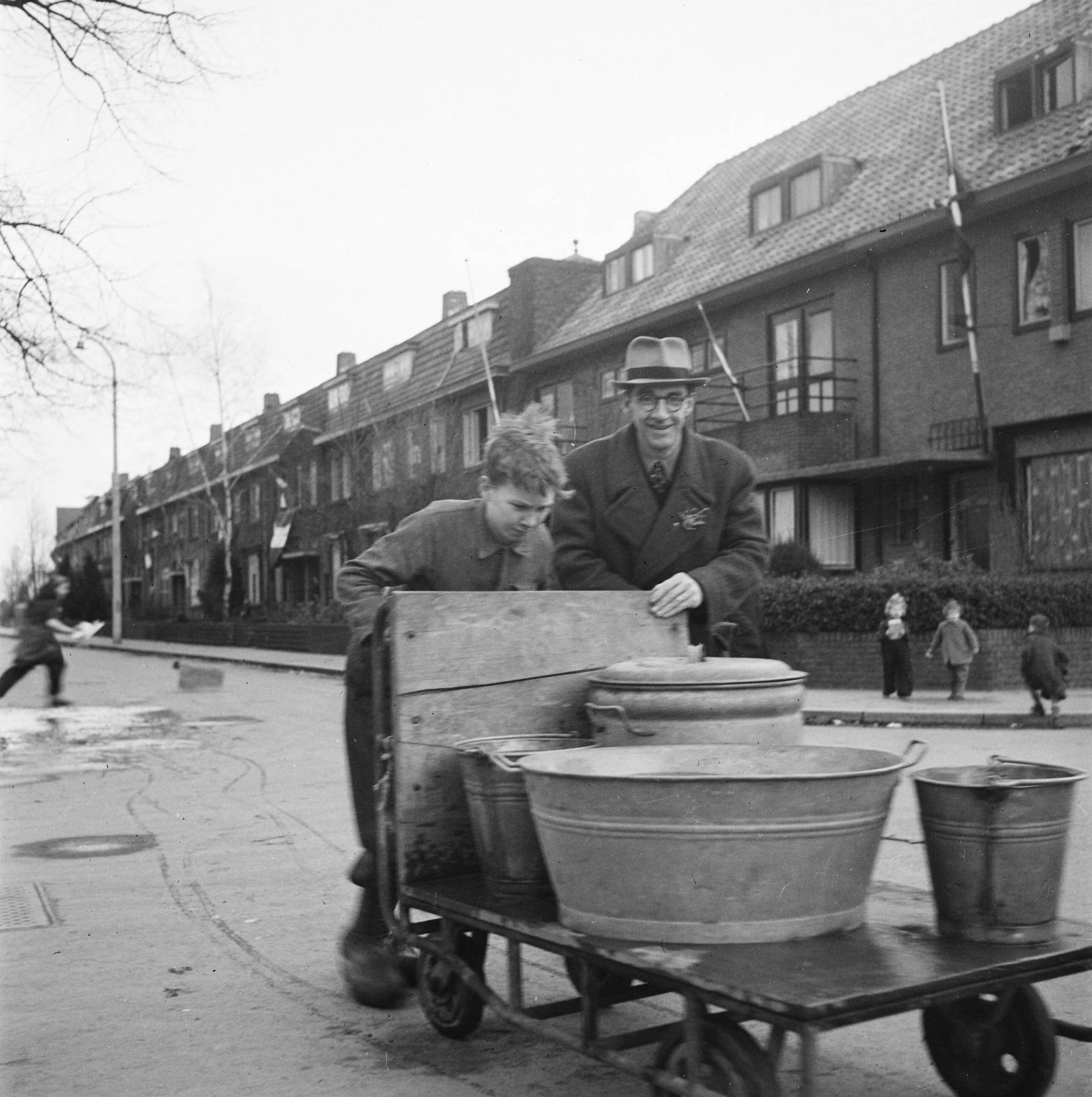Naar huis teruggekeerde evacués halen water omdat de waterleiding in de woonhuizen is afgesloten