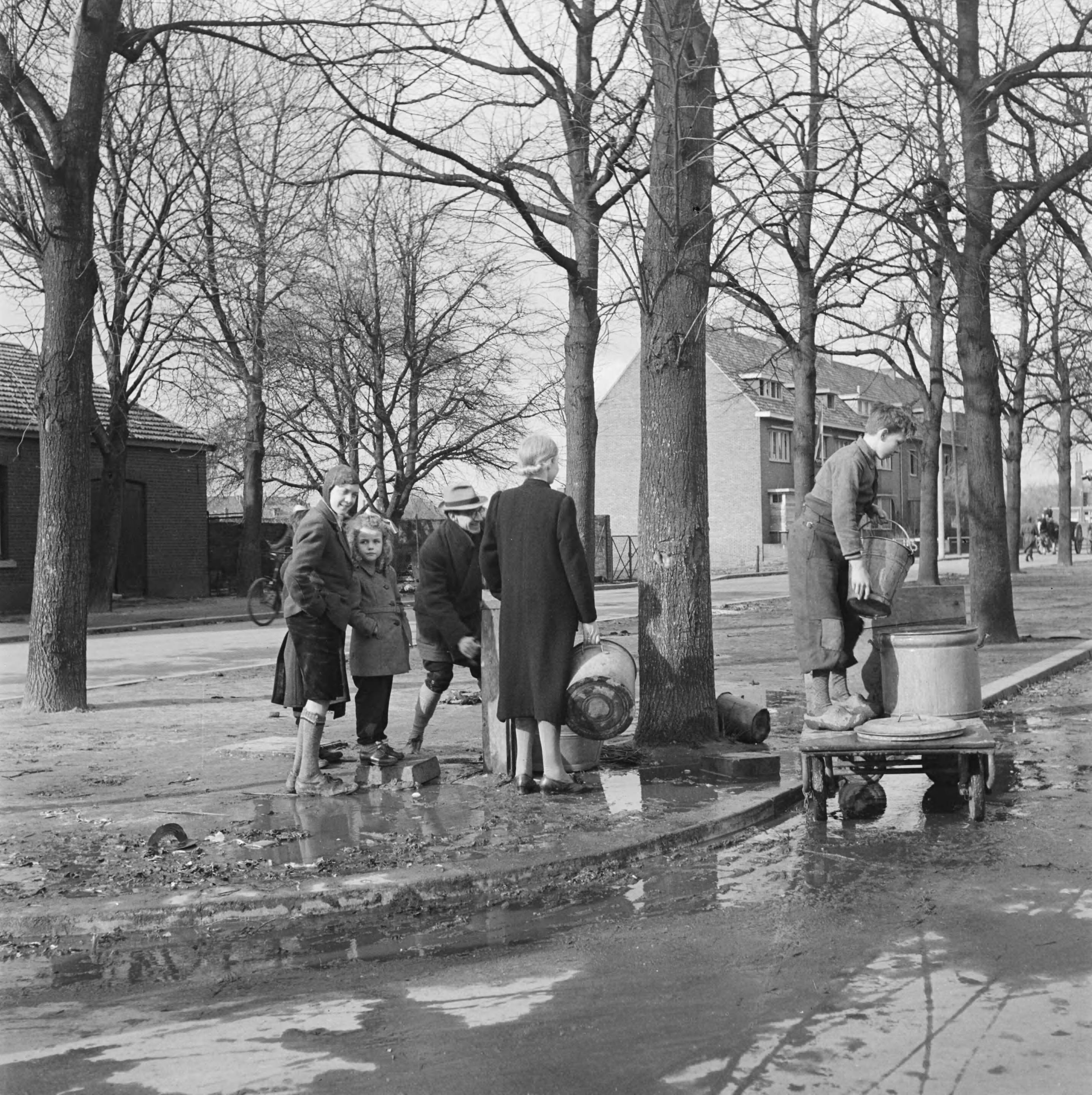 Naar huis teruggekeerde evacués halen water omdat de waterleiding in de woonhuizen is afgesloten
