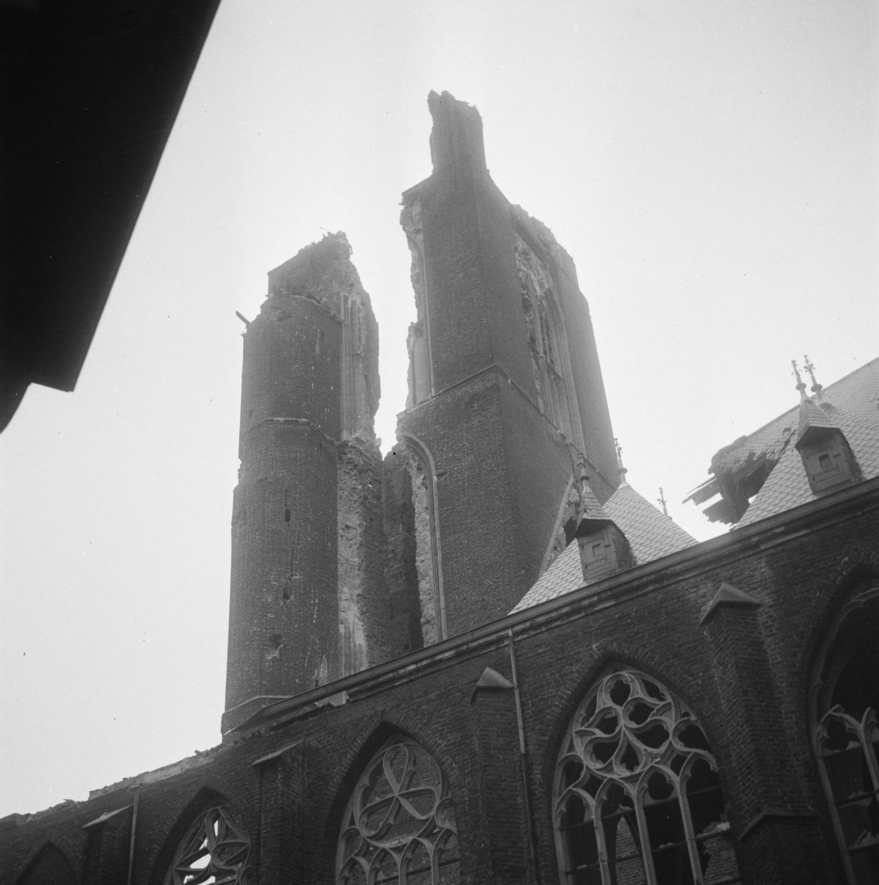 De toren van de Sint-Christoffelkathedraal in Roermond werd de dag voor de bevrijding door de Duitsers opgeblazen.