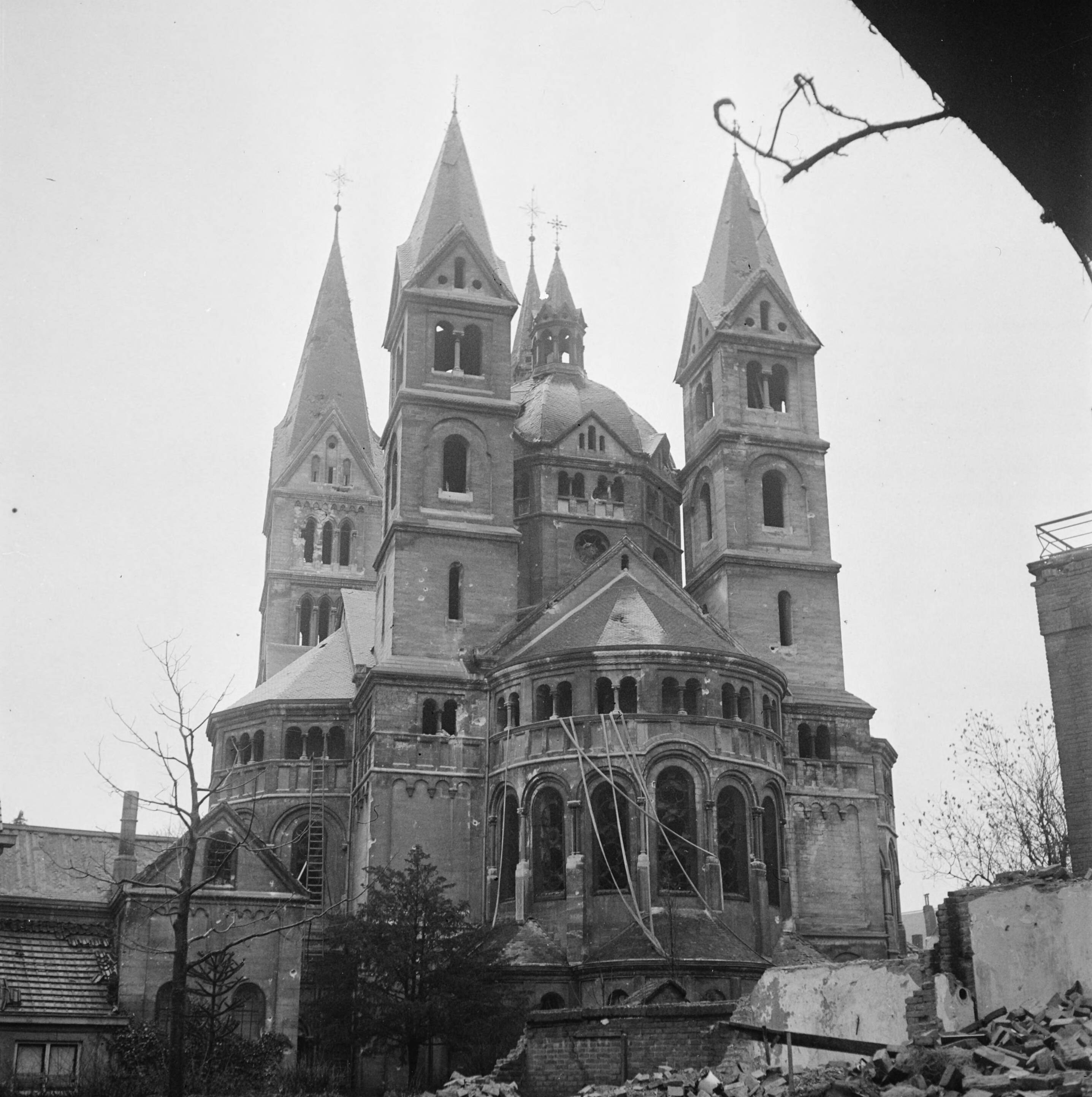 De romaanse Munsterkerk in Roermond, die bij de oorlogshandelingen licht werd beschadigd.