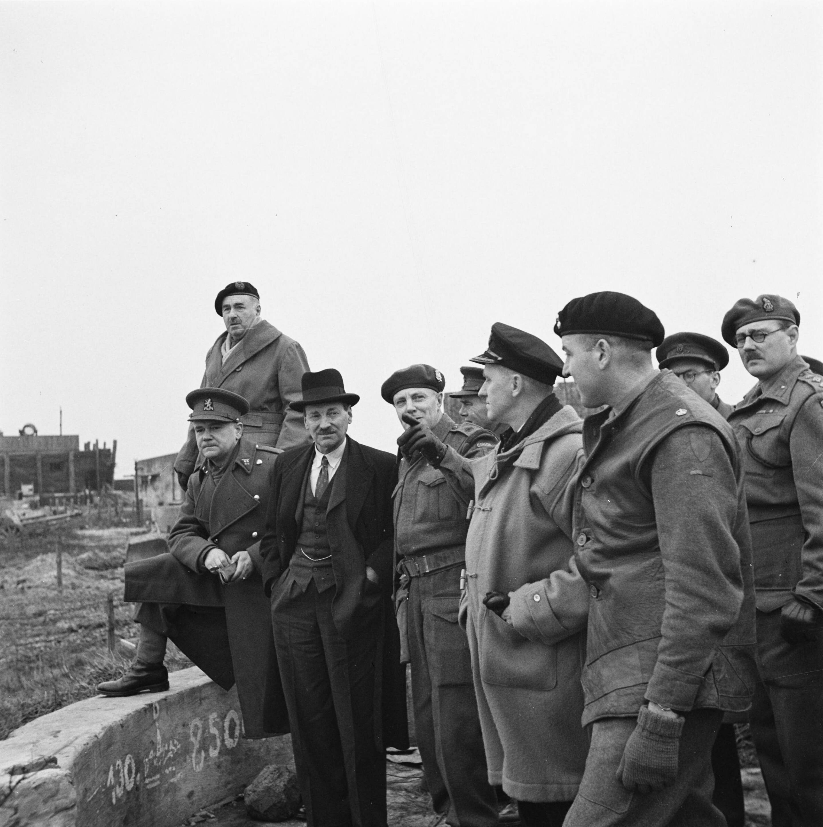 Minister Attlee (met hoed) krijgt uitleg in Vlissingen. Vlnr. generaal Kruls, Attlee, een Canadese officier, een Britse marine-officier en een Britse cavalerie-officier