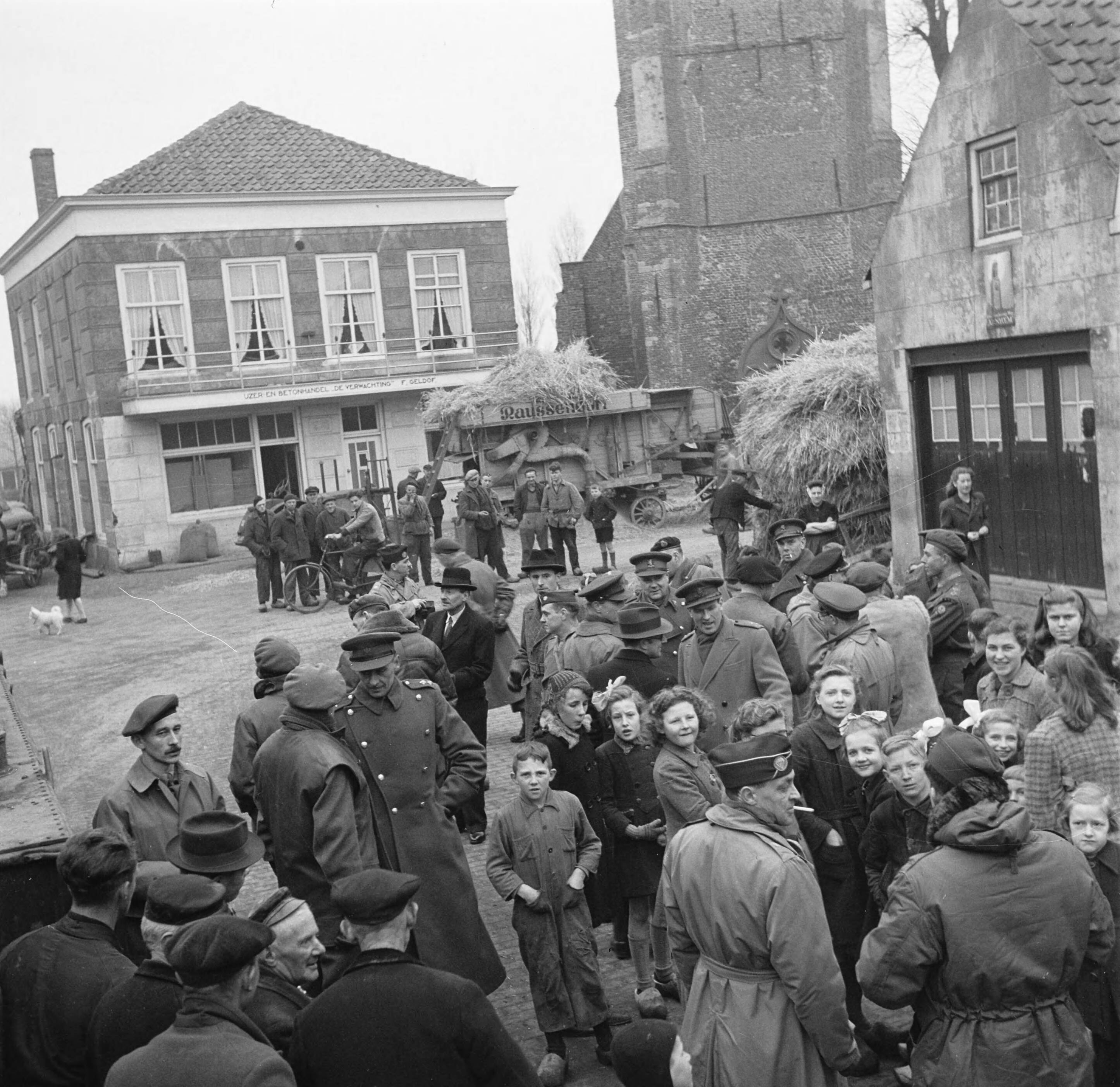 Minister Attlee (man in zwarte pak met hoed in het midden van de foto) in Serooskerke, kruising Noordweg bij de kerk