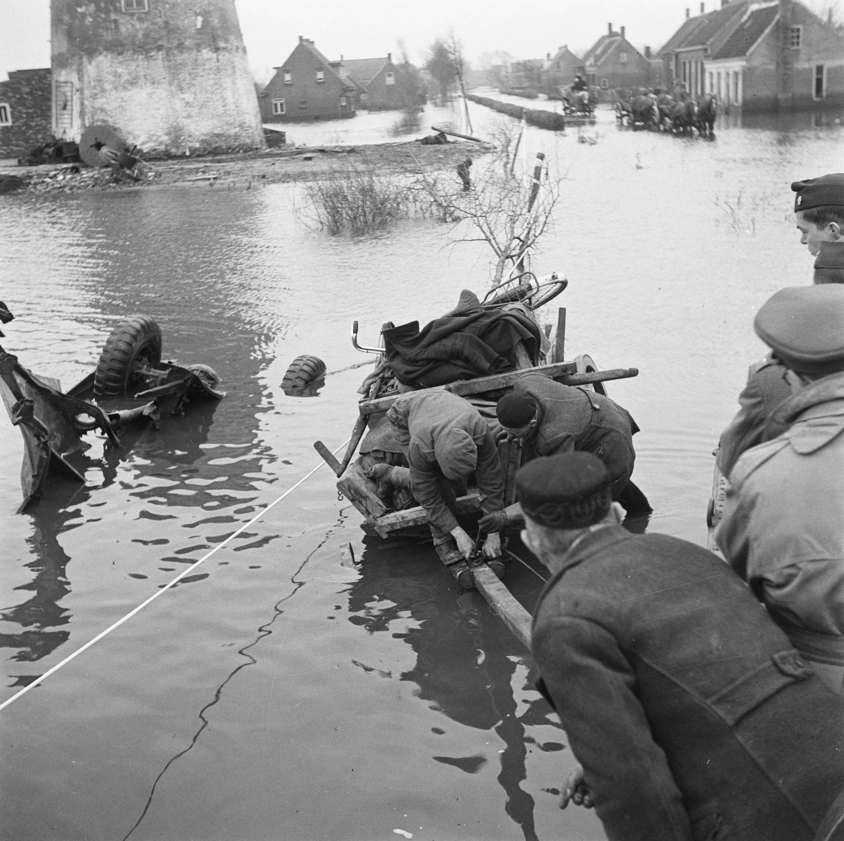 Britse militairen op het geinundeerde Walcheren bij de molen te Sint Laurens (richting Middelburg). Een gestrande man met handkar wordt geholpen