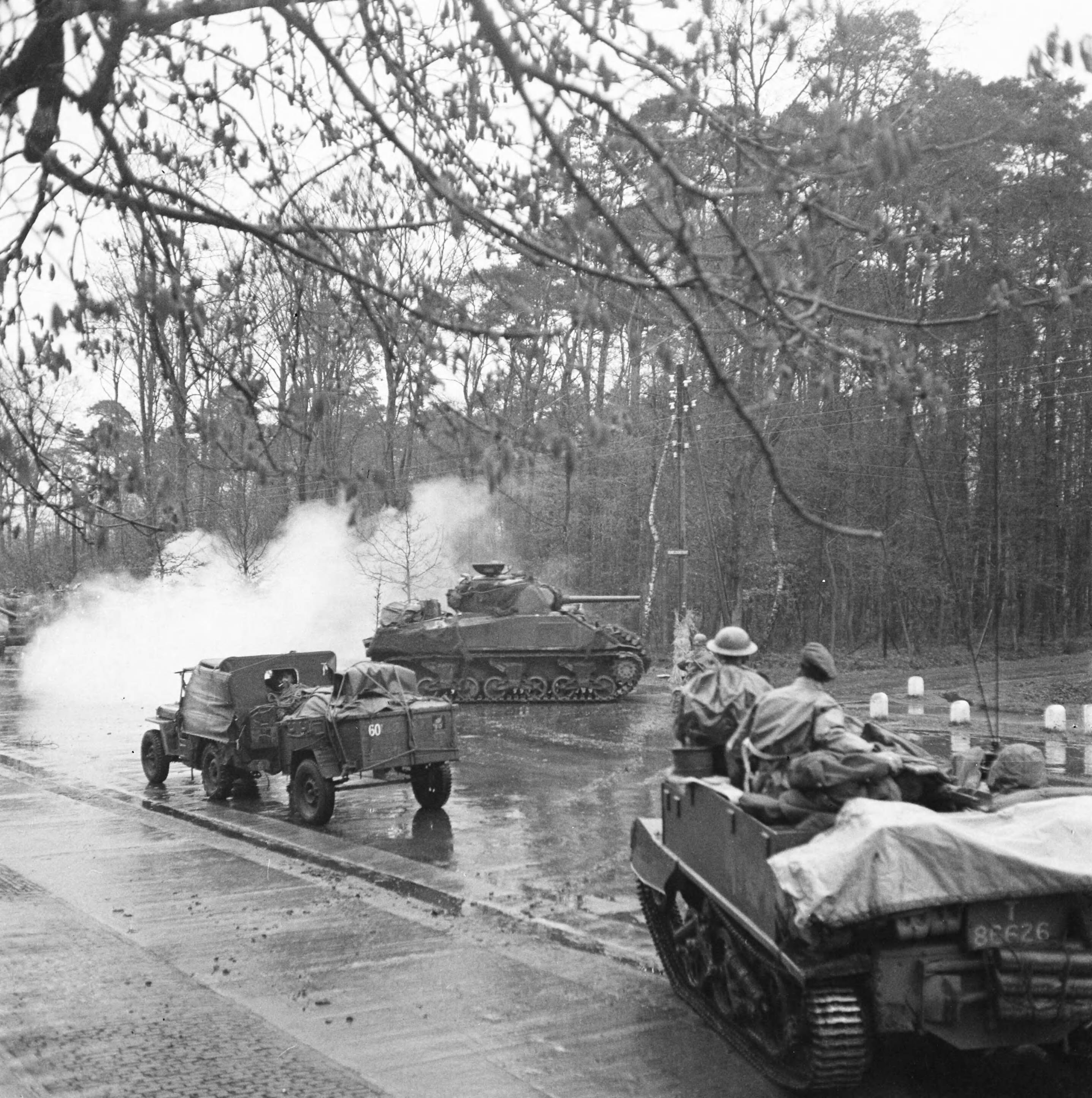 De Sherwood Rangers Yeomanry rukken op bij de Broeierd aan de Hengelosestraat in Enschede. De tank rijdt de Bosweg in