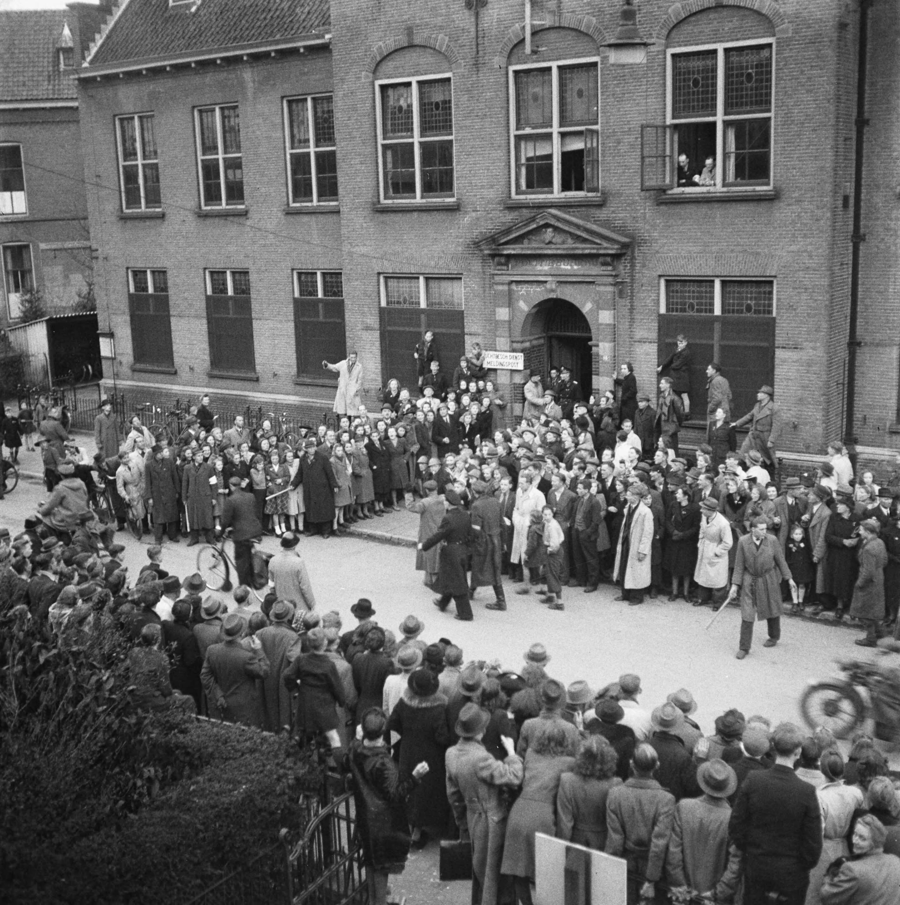 NSB-ers worden opgebracht naar het politiebureau te Enschede aan de Haaksbergerstraat