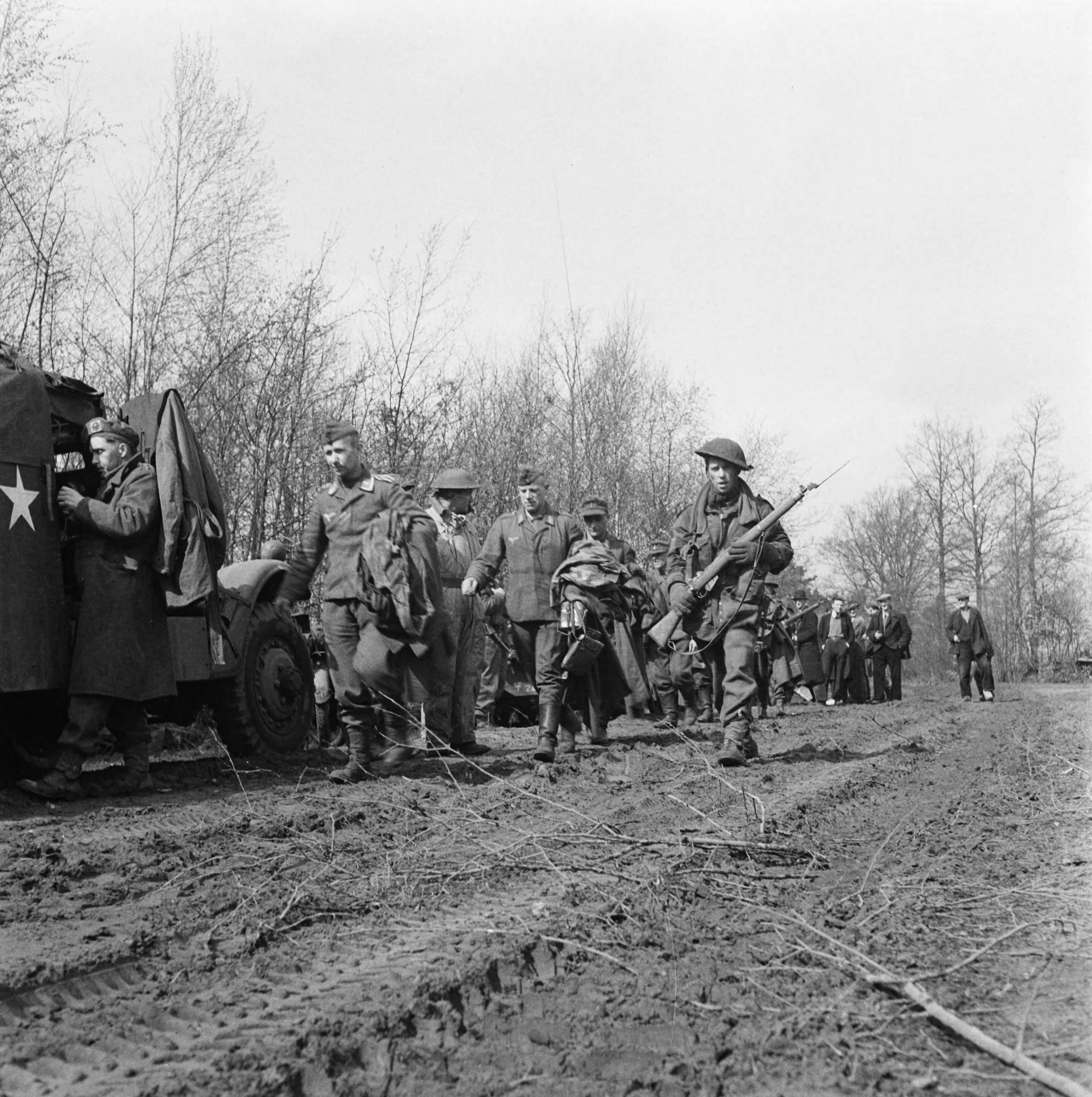 Britse militairen brengen Duitse krijgsgevangenen (Luftwaffe) tijdens de opmars in de buurt van Hengelo naar de gereedstaande voertuigen.