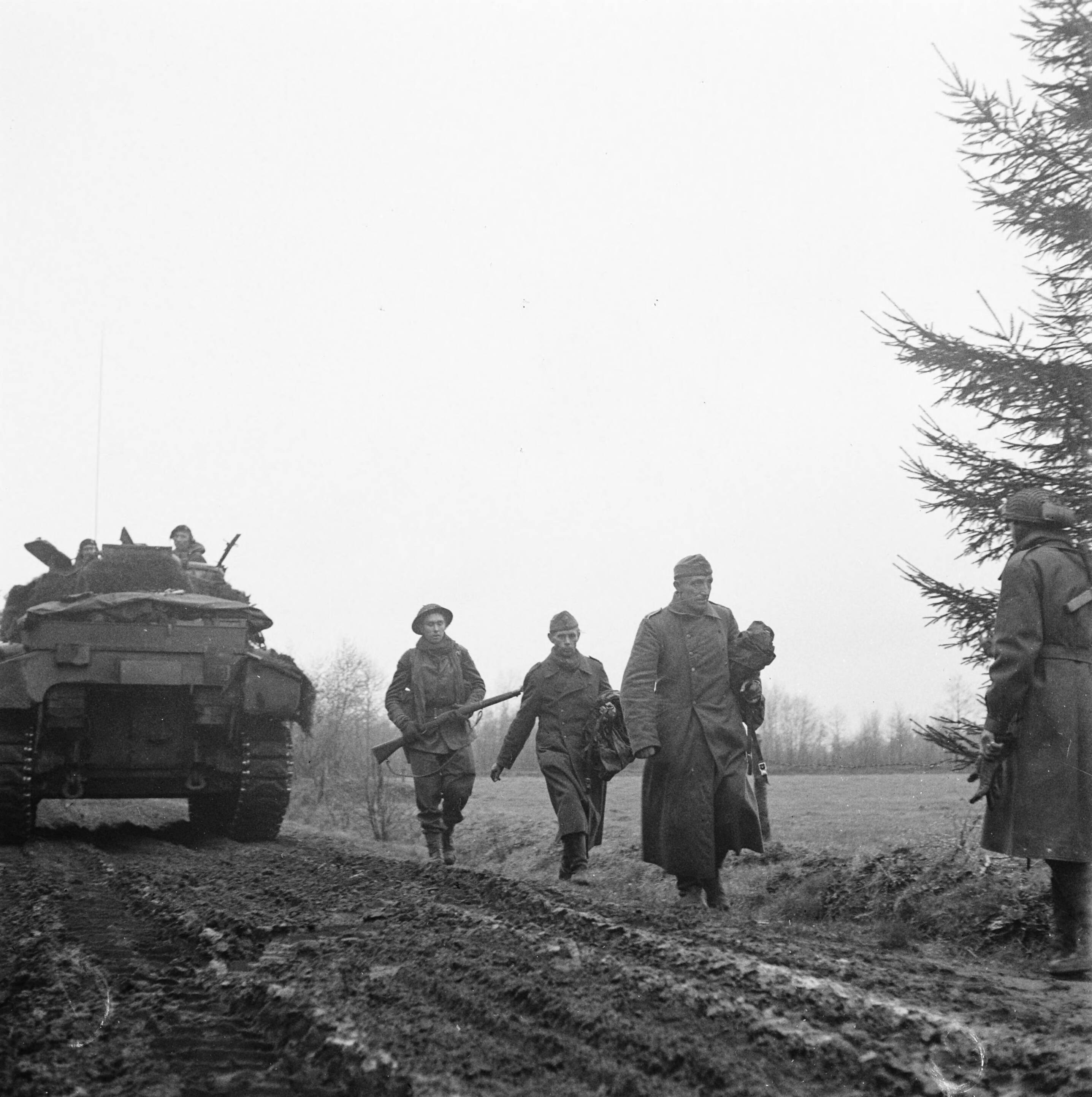 Duitse krijgsgevangenen worden door Britse militairen opgebracht