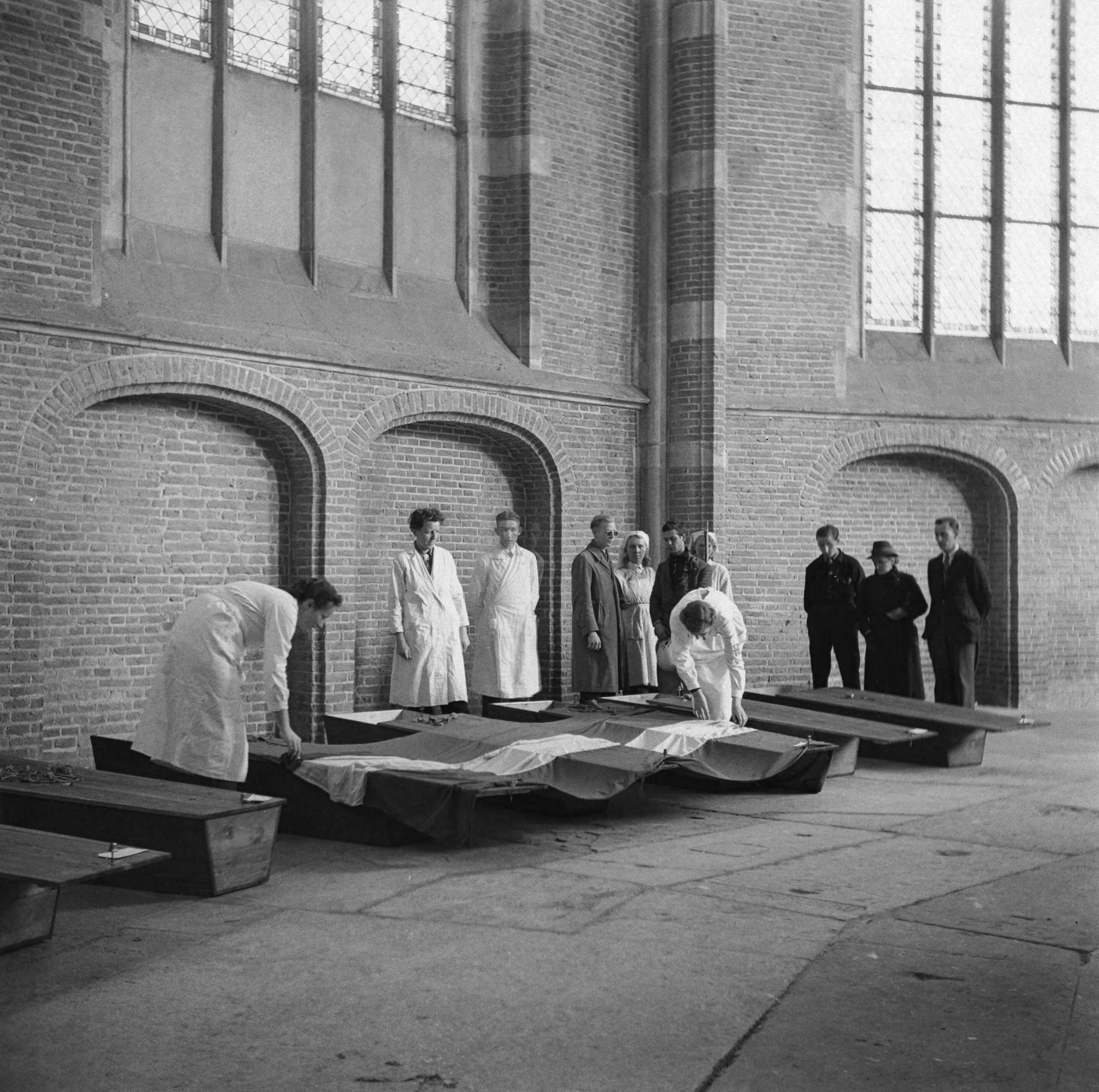 Opgebaarde slachtoffers en verzetsstrijders in de Grote Kerk van Deventer. Verpleegsters leggen de Nederlandse driekleur over de kisten. Enkele familieleden zijn ter identificatie aanwezig