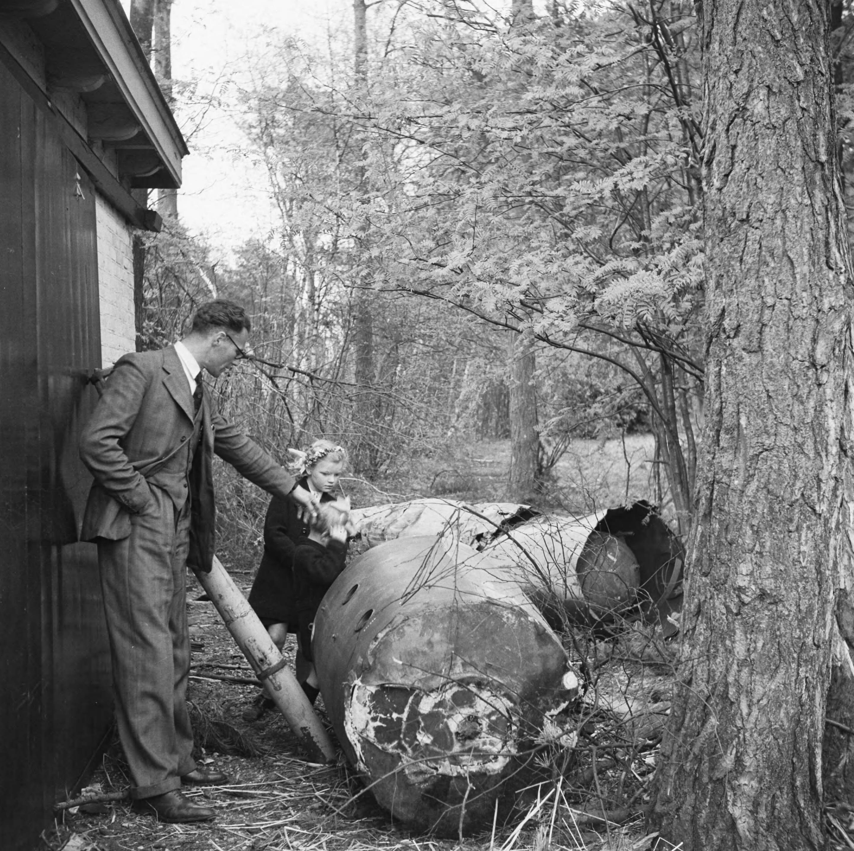 Lanceerinstallatie van Duitse V-1 raketten bij Almelo (Paradijsbos). Man met twee meisjes bij restanten van een V1