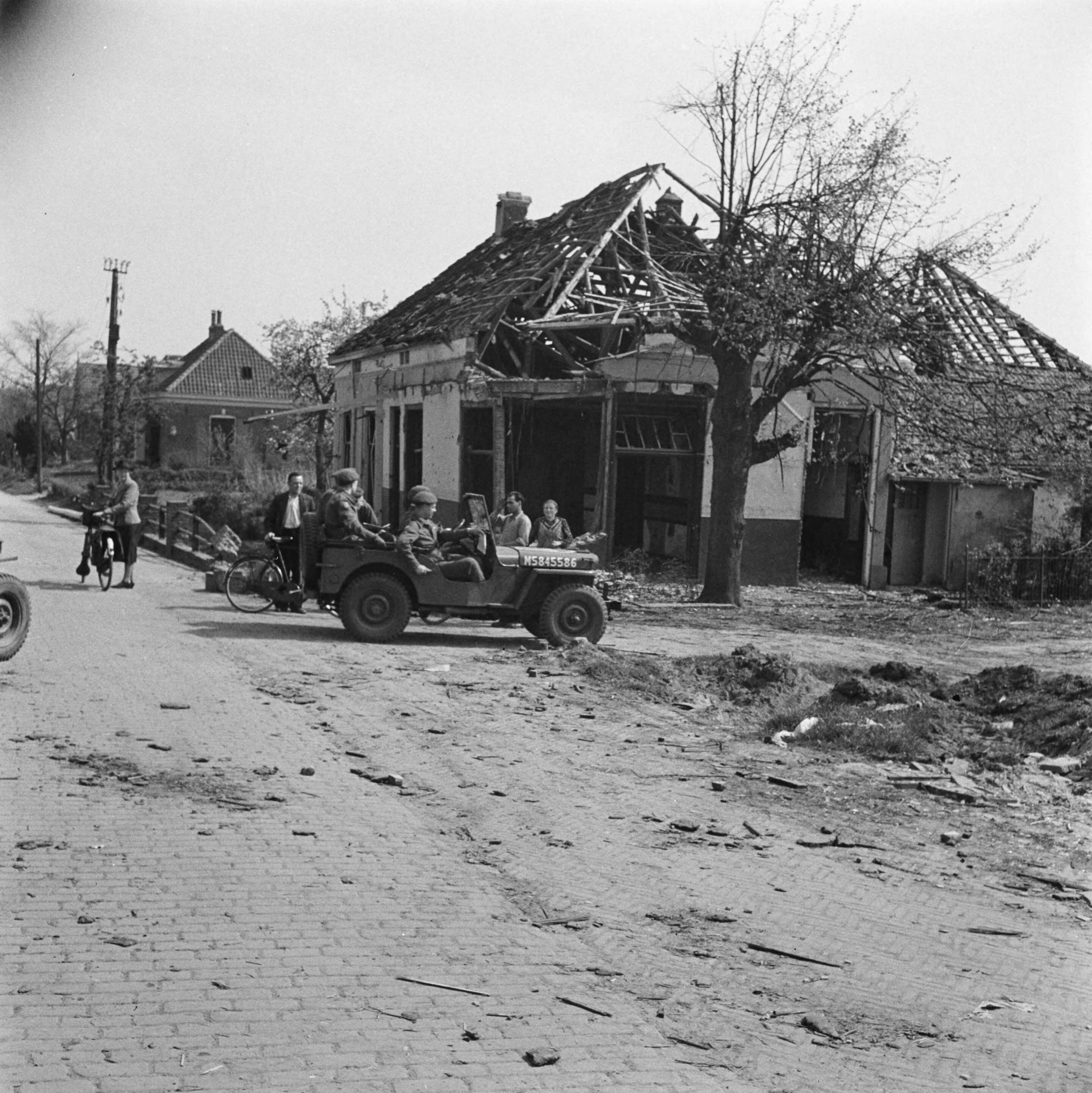 De prins passeert met zijn jeep verwoeste woningen
