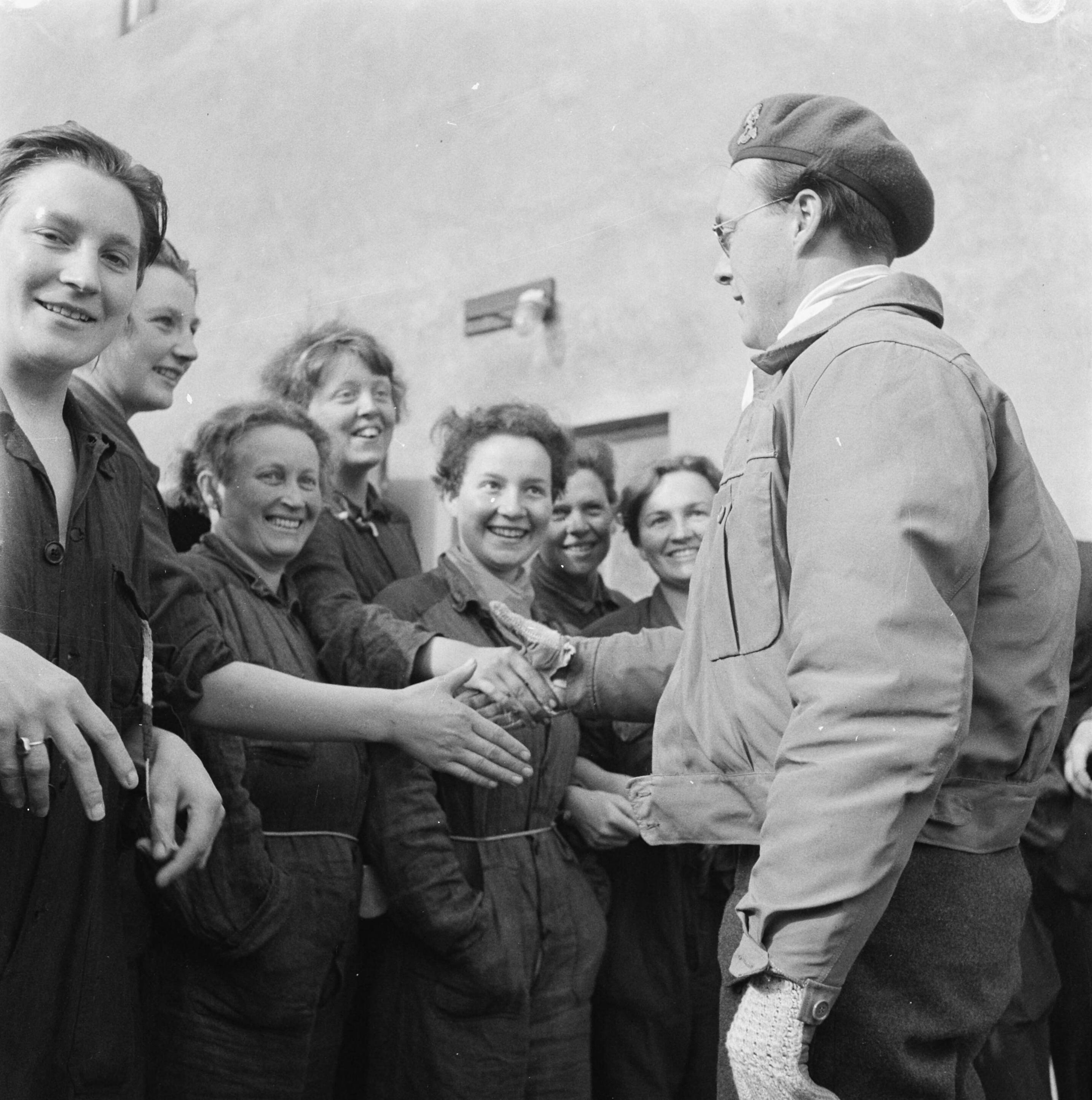 De prins schudt in Grijpskerk de handen van bevrijde vrouwelijke ex-gedetineerden uit kamp Westerbork