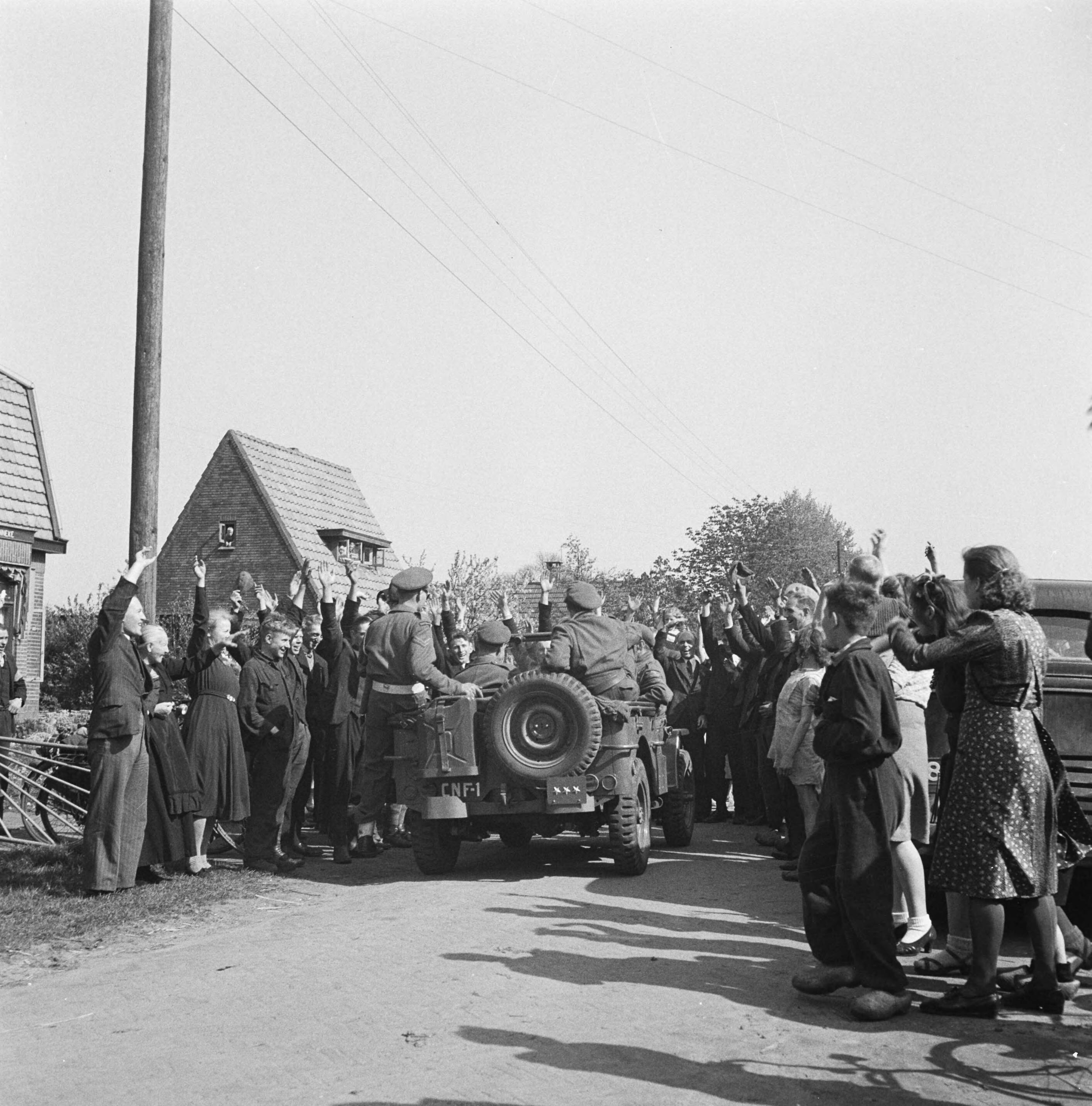 Prins Bernhard en zijn gevolg worden door een menigte begroet
