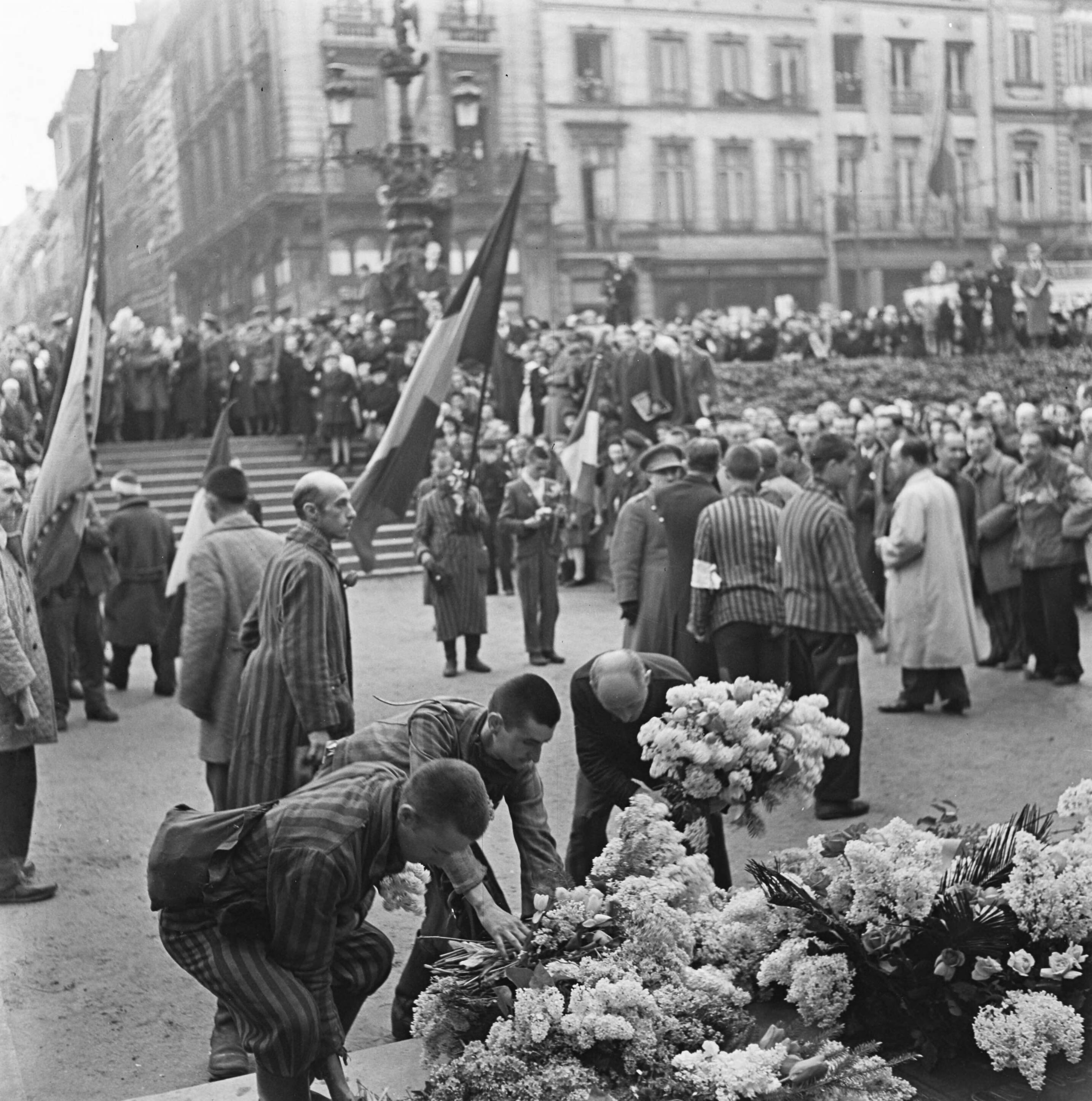 Kranslegging door bevrijde Franse politieke gevangenen op het graf van de Onbekende Soldaat te Brussel.