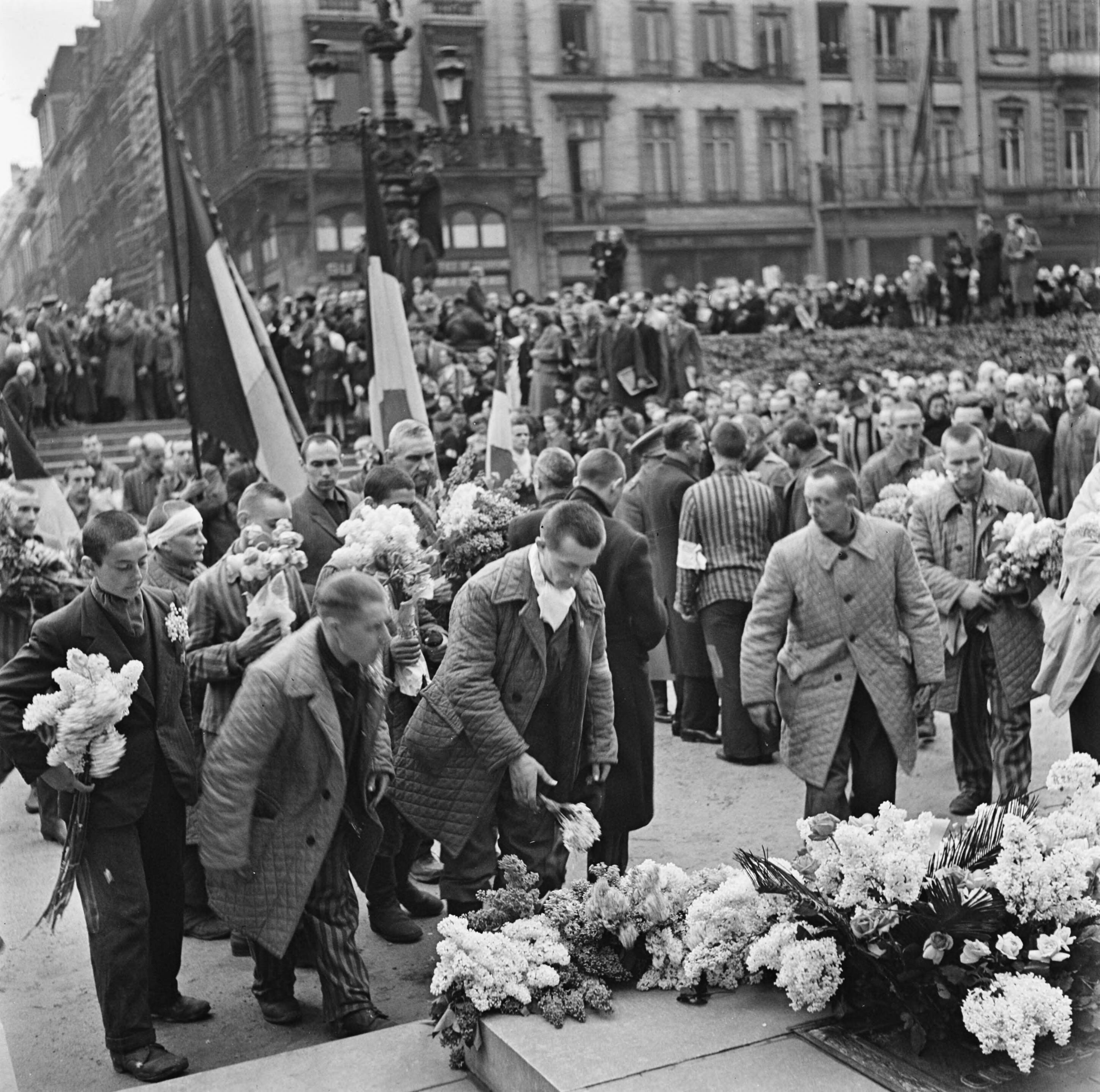 Kranslegging door bevrijde Franse politieke gevangenen op het graf van de Onbekende Soldaat te Brussel.