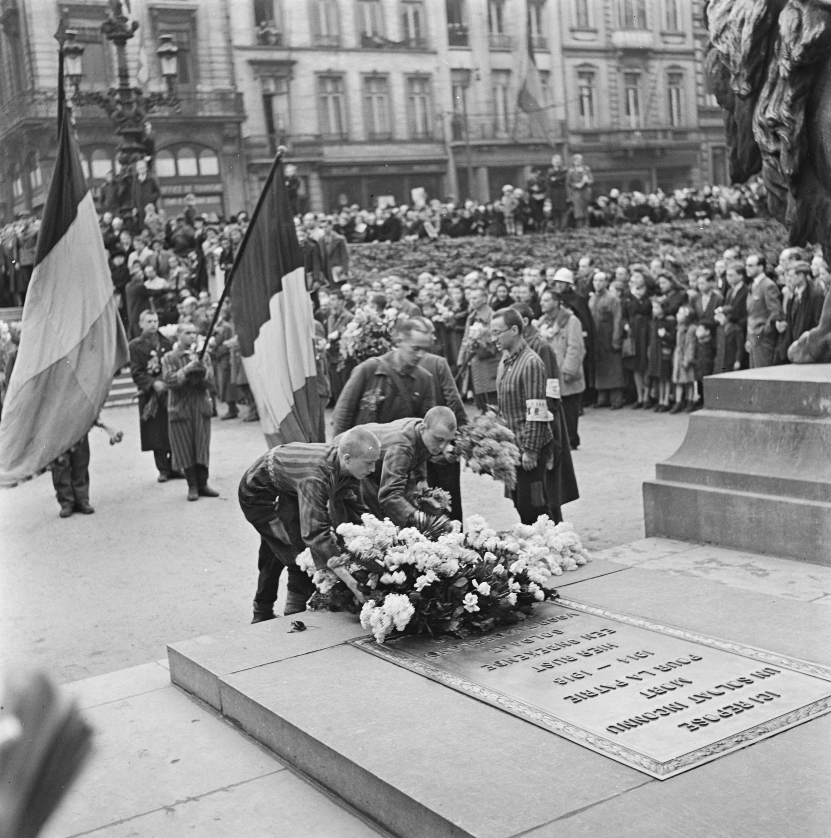 Kranslegging door bevrijde Franse politieke gevangenen op het graf van de Onbekende Soldaat te Brussel.
