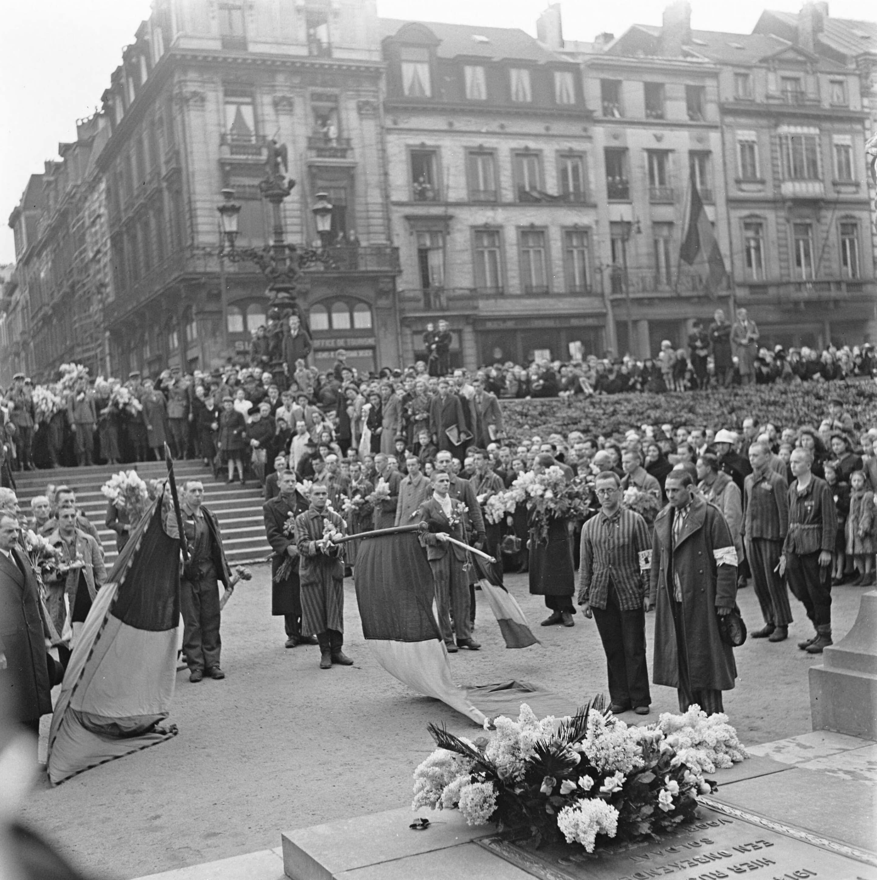 Kranslegging door bevrijde Franse politieke gevangenen op het graf van de Onbekende Soldaat te Brussel.