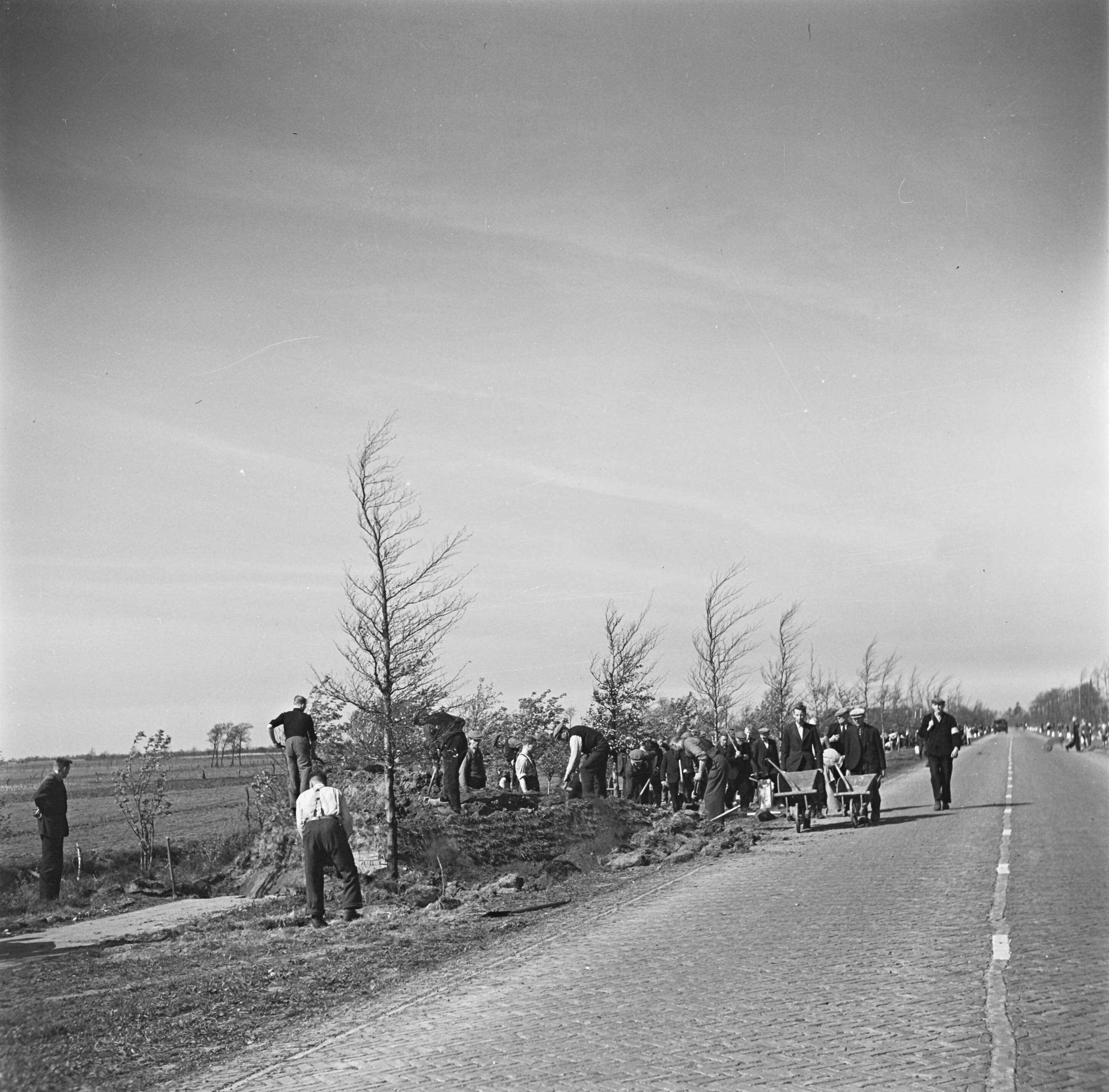 Strijd en schade in Groningen en Friesland (front n.o.-Nederland). NSB-ers verrichten graafwerkzaamheden onder toezicht van leden van de BS (Binnenlandse Strijdkrachten).