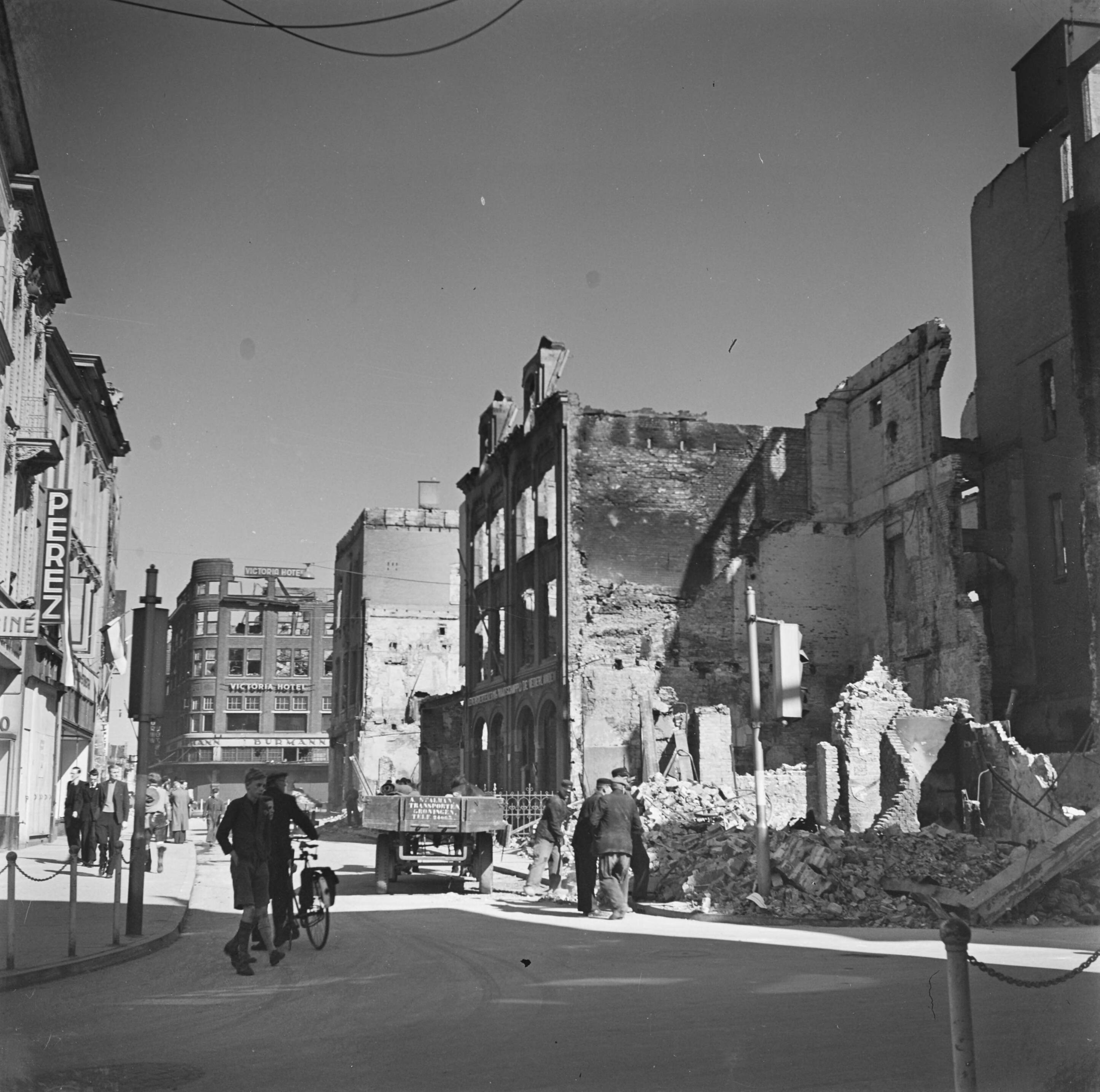 Verwoestingen in de binnenstad van Groningen; op de achtergrond het Victoria Hotel.