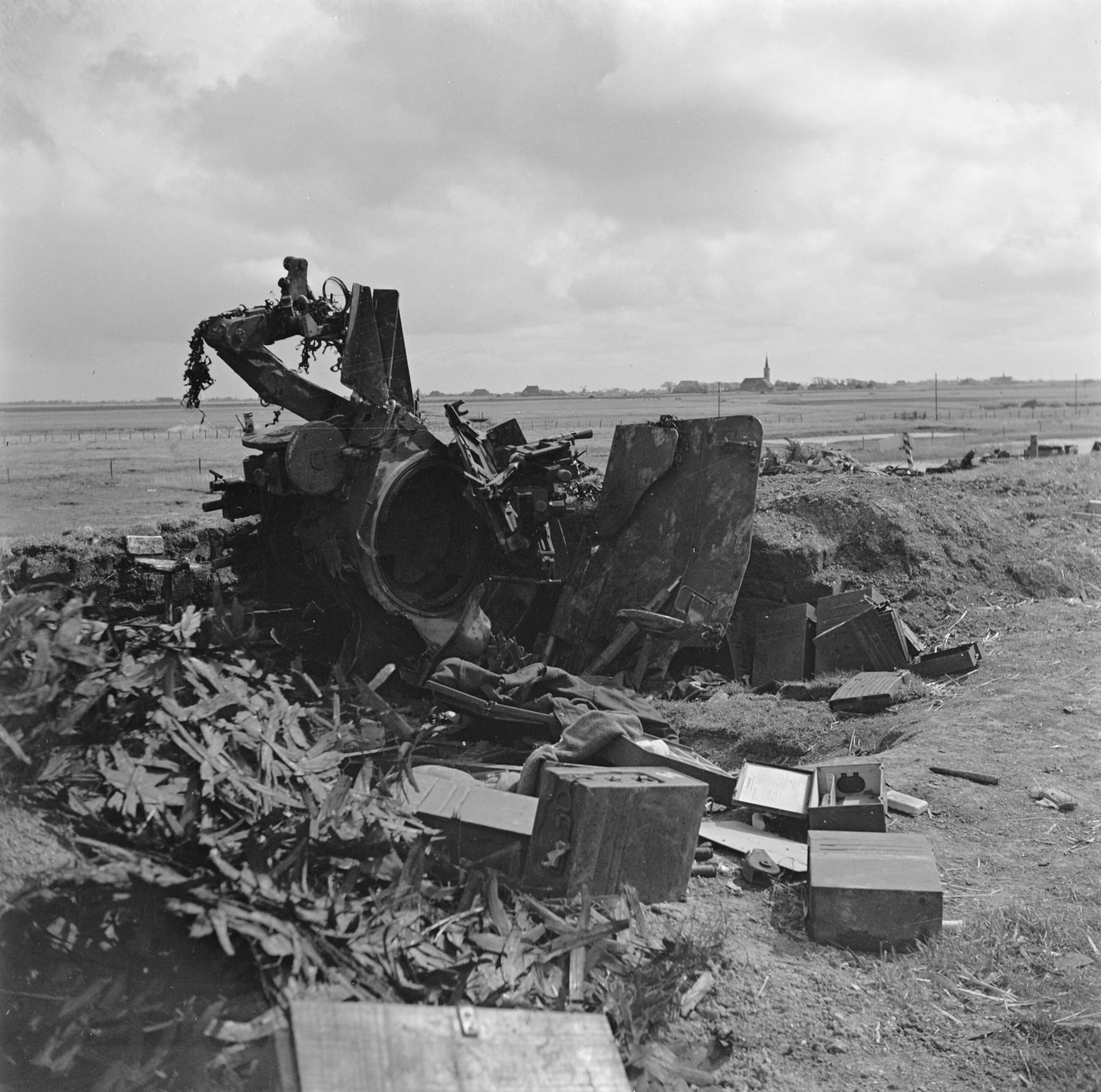Vernielde Duitse geschutsopstelling bij de Kop van de Afsluitdijk.