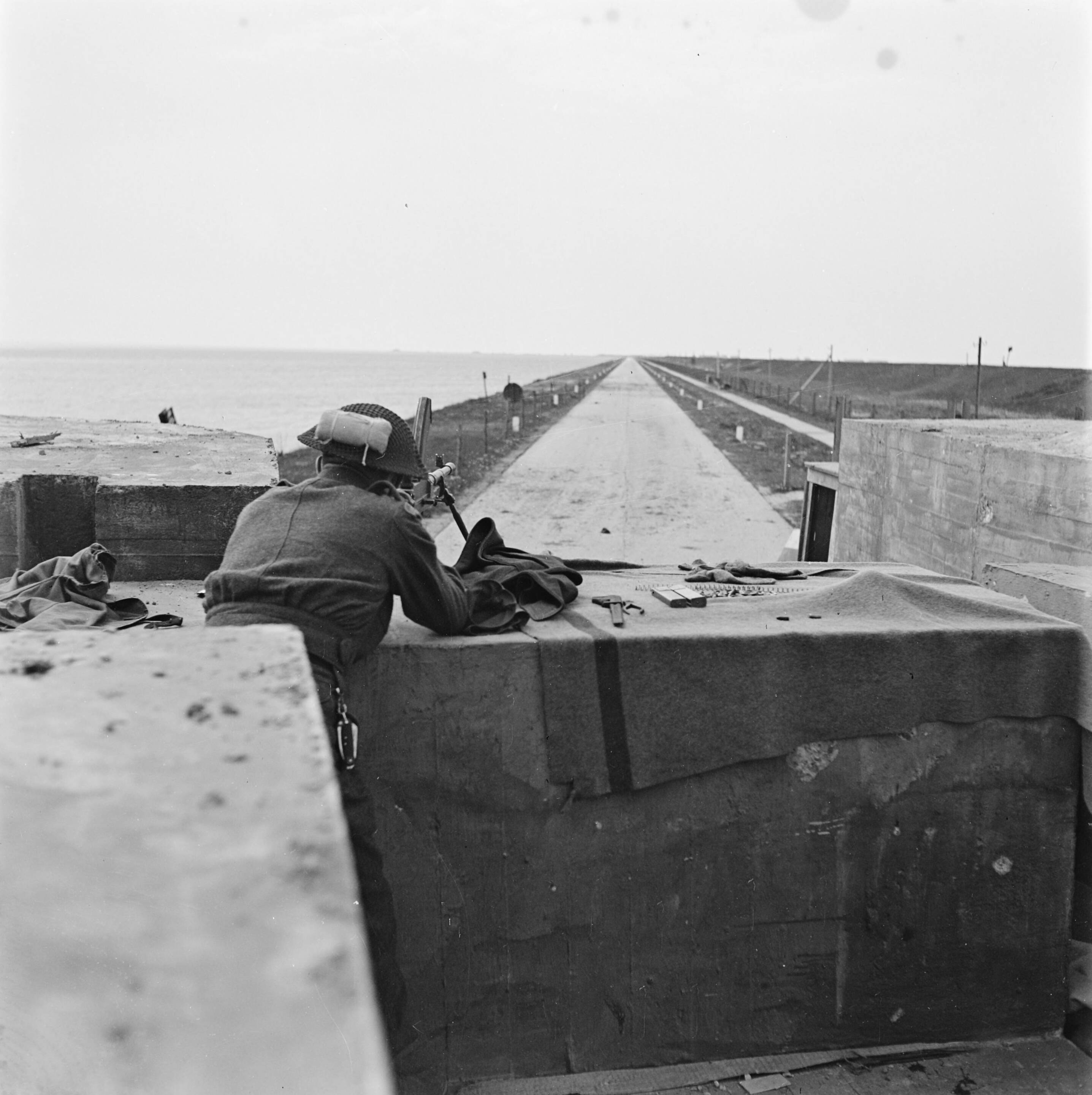 Met de bevrijding van Noord Nederland hebben de geallieerde troepen de stellingen bij de Afsluitdijk bij Zurich (Friesland) in handen gekregen. Zij kunnen nu de Duitse stellingen overzien. De vijand nestelt nog op de strook Kornwerderzand. Canadese militair paraat achter een brenmitrailleur op de Kop van de Afsluitdijk (richting Kornwerderzand).