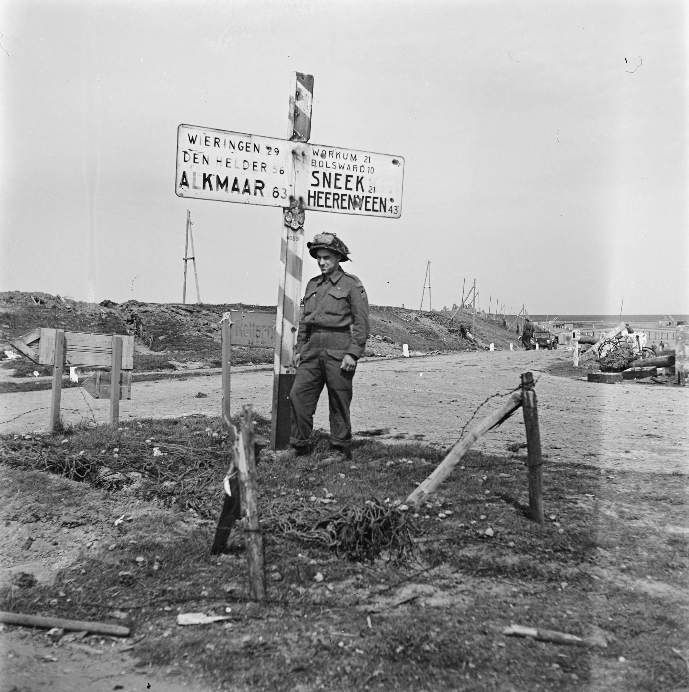 Met de bevrijding van Noord Nederland hebben de geallieerde troepen de stellingen bij de Afsluitdijk bij Zurich (Friesland) in handen gekregen. Een van de bevrijders bij een ANWB-wegwijzer op de Kop van de Afsluitdijk.