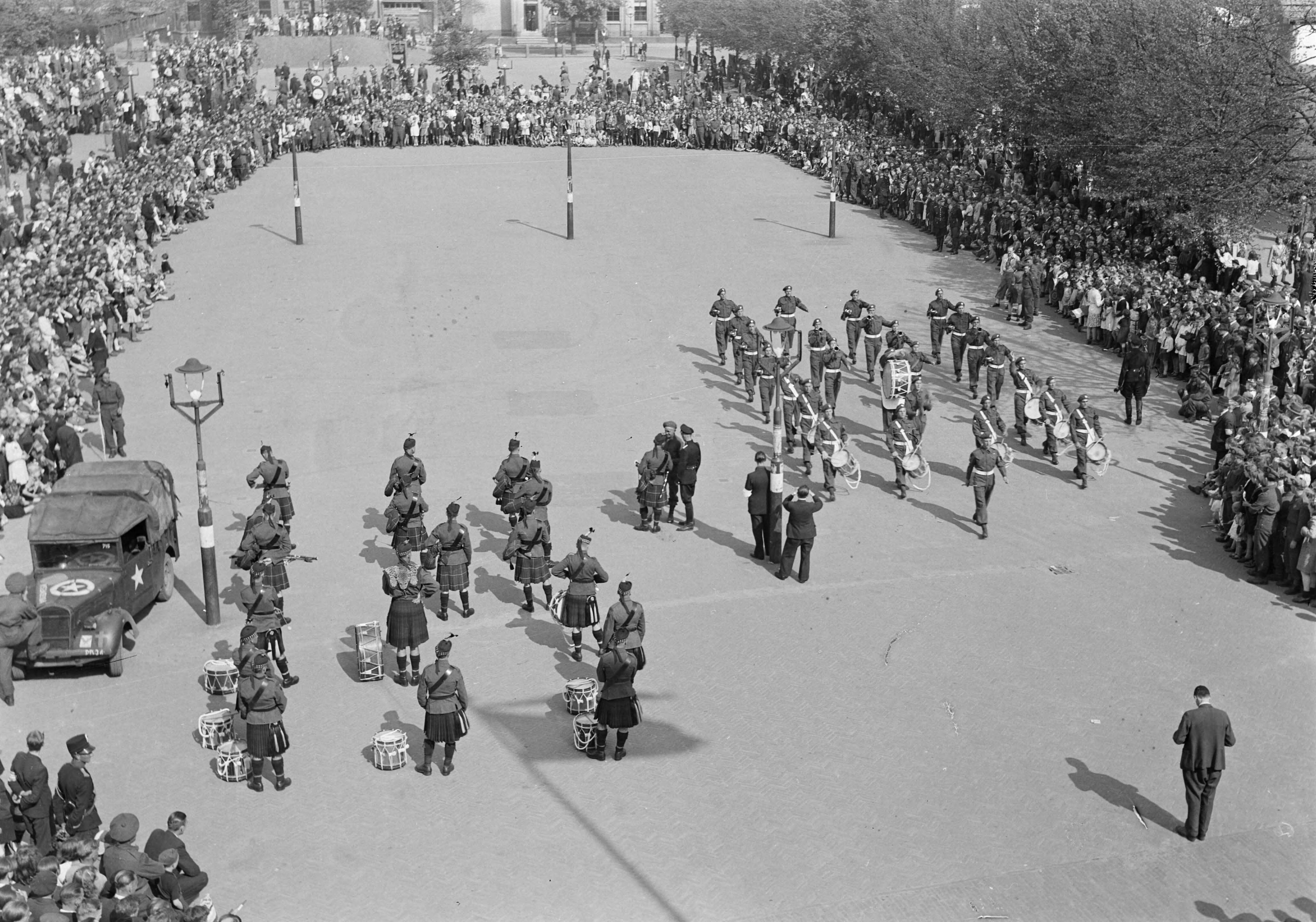 Militaire muziekkorpsen paraderen op het Marktplein te Apeldoorn, onder grote belangstelling