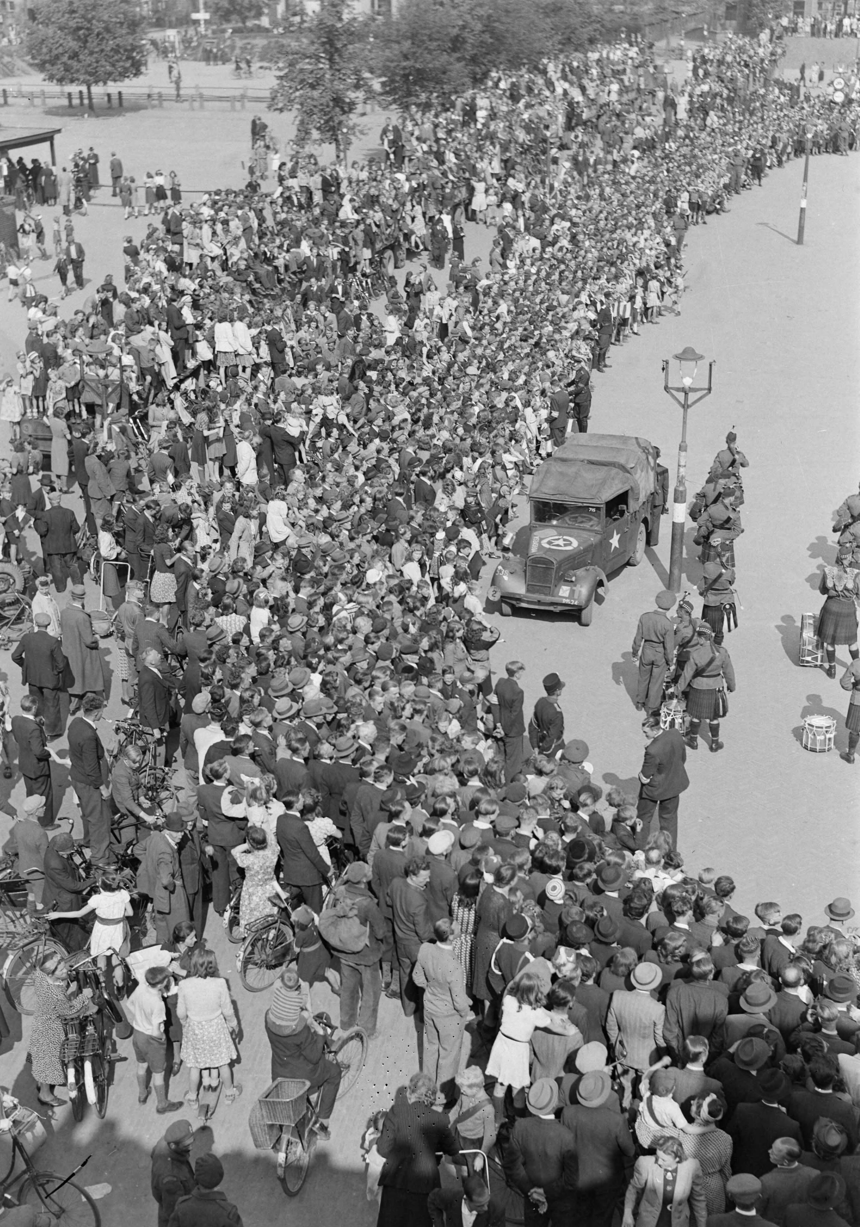 Publiek op het Marktplein te Apeldoorn. Rechts muziekkorps met doedelzakspelers