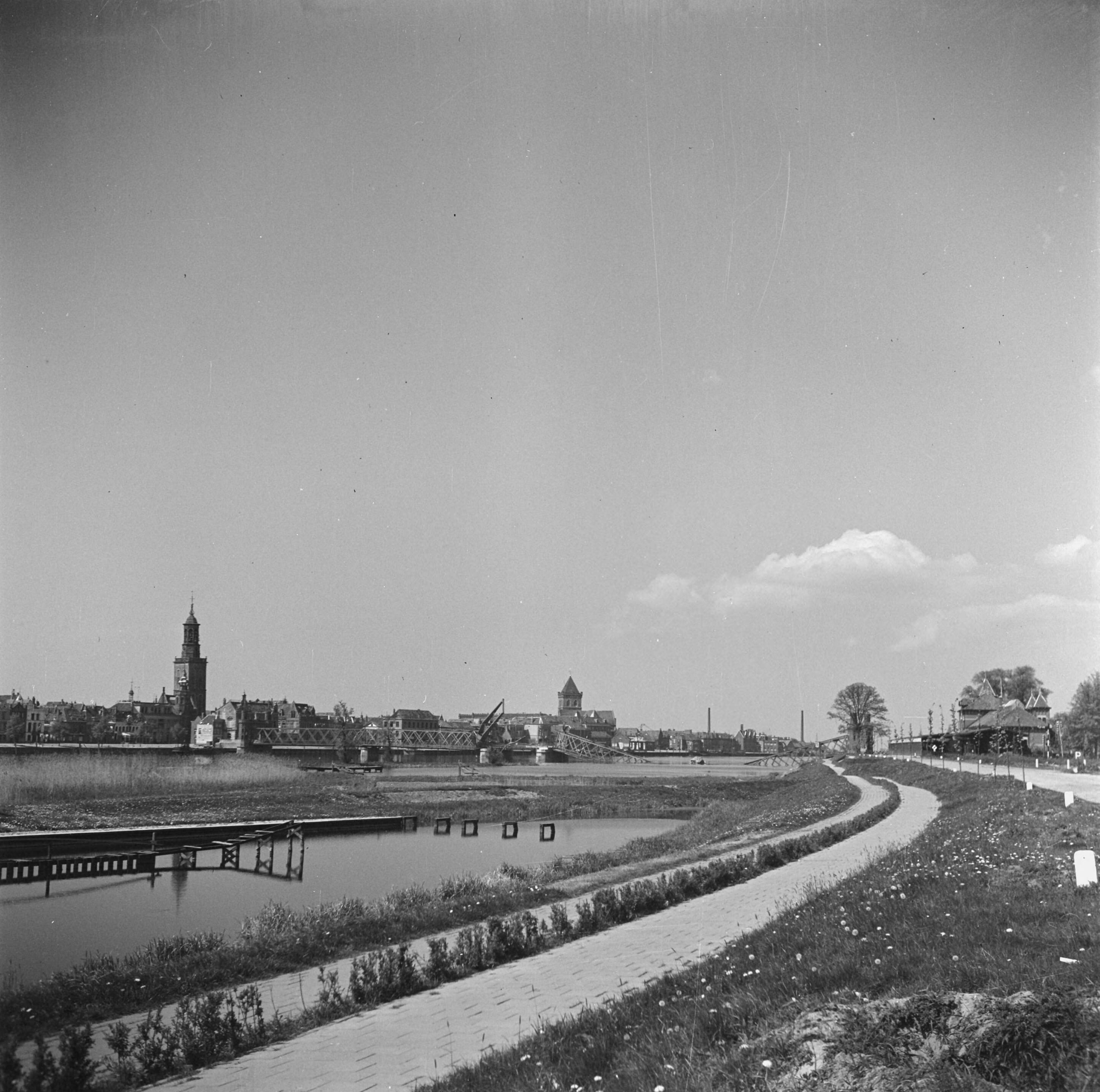 Gezicht op Kampen vanaf de rijksweg naar Zwolle te IJsselmuiden. De brug is vernield
