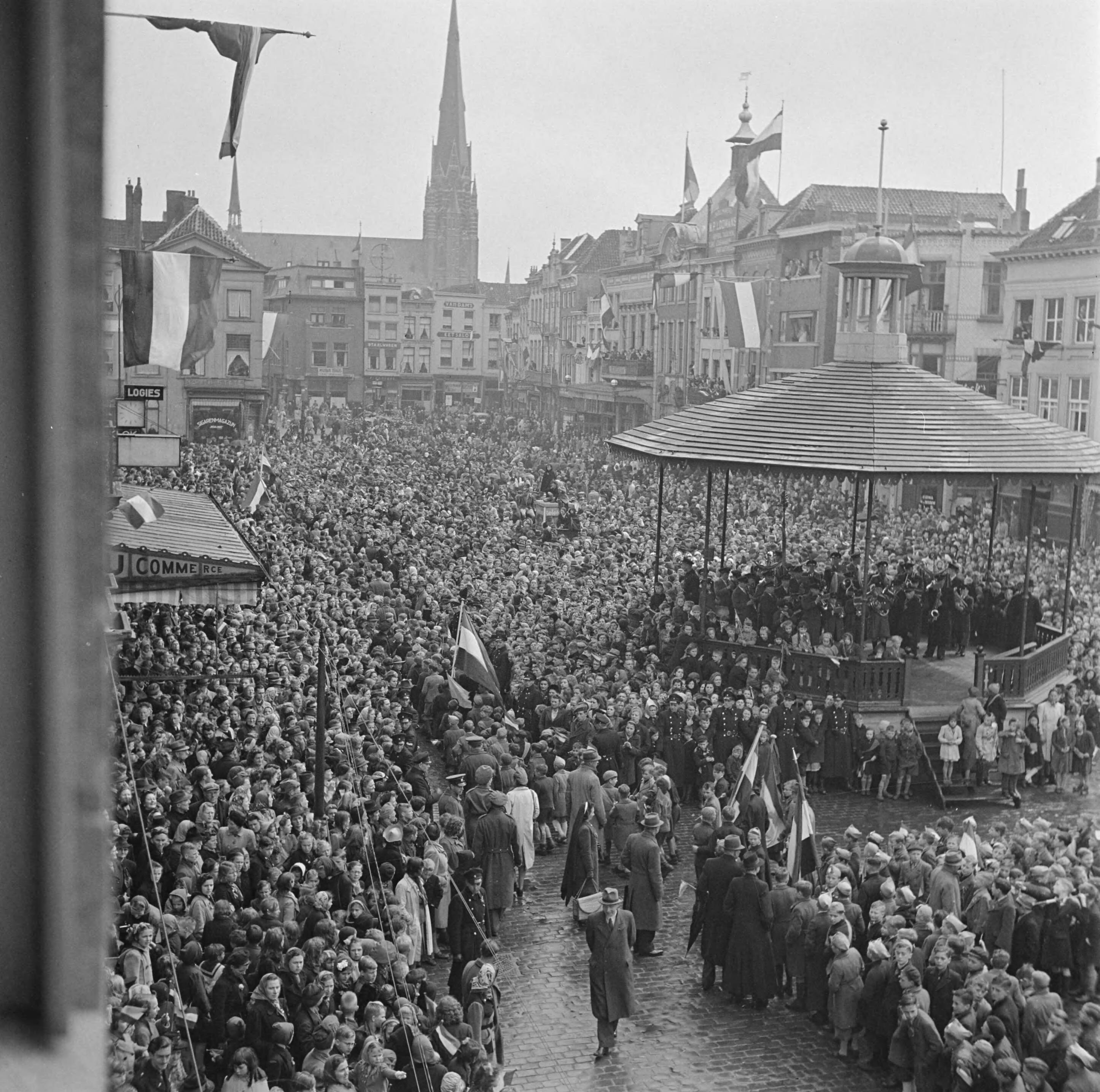 Het muziekkorps staat gereed temidden van de massaal uitgelopen bevolking van de stad Breda