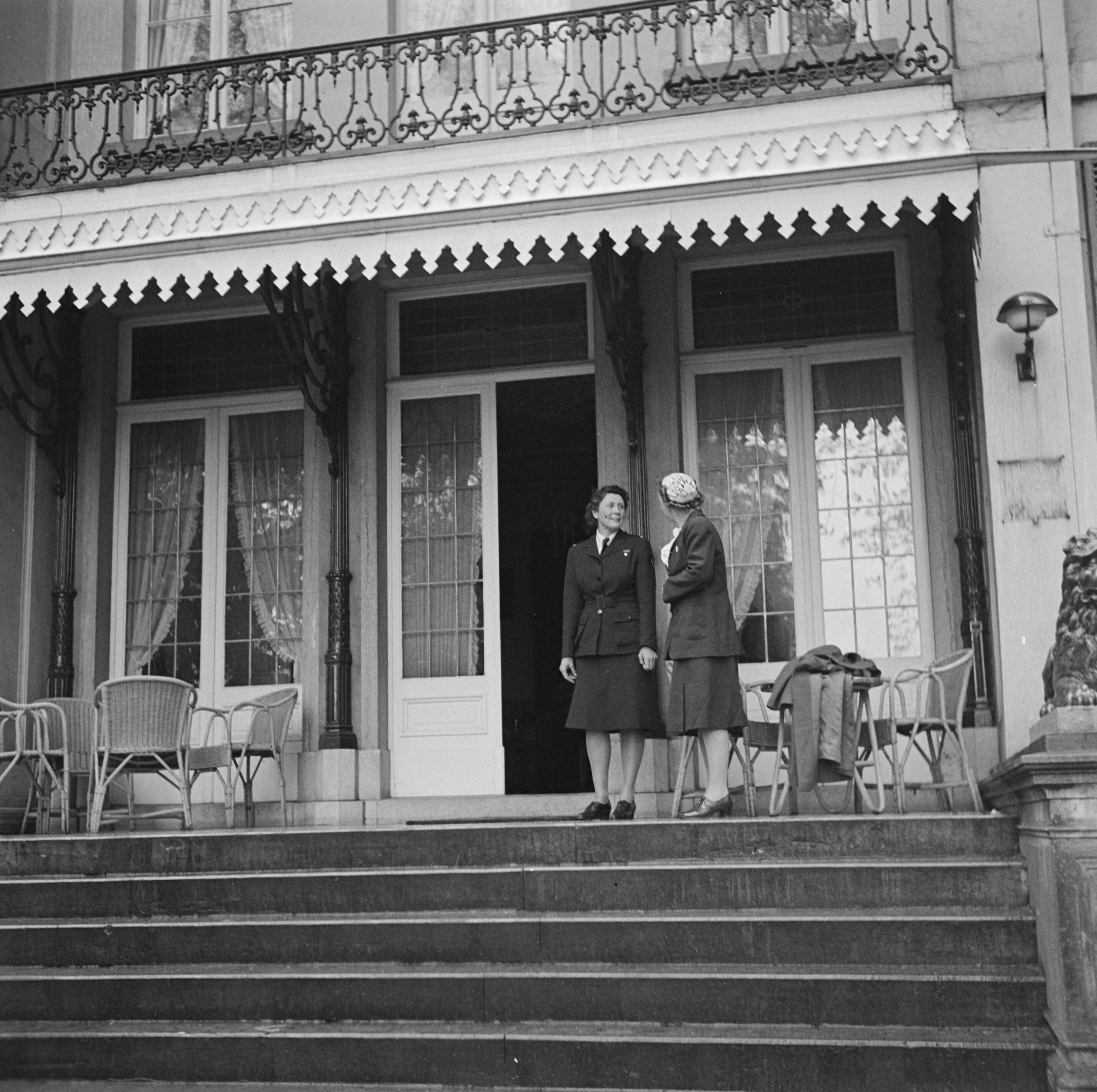 Prinses Juliana voor Villa 'Anneville' te Ulvenhout, waar de koningin na haar terugkomst uit Engeland enige tijd verbleef.. Prinses Juliana in gesprek met Rie Stokvis
