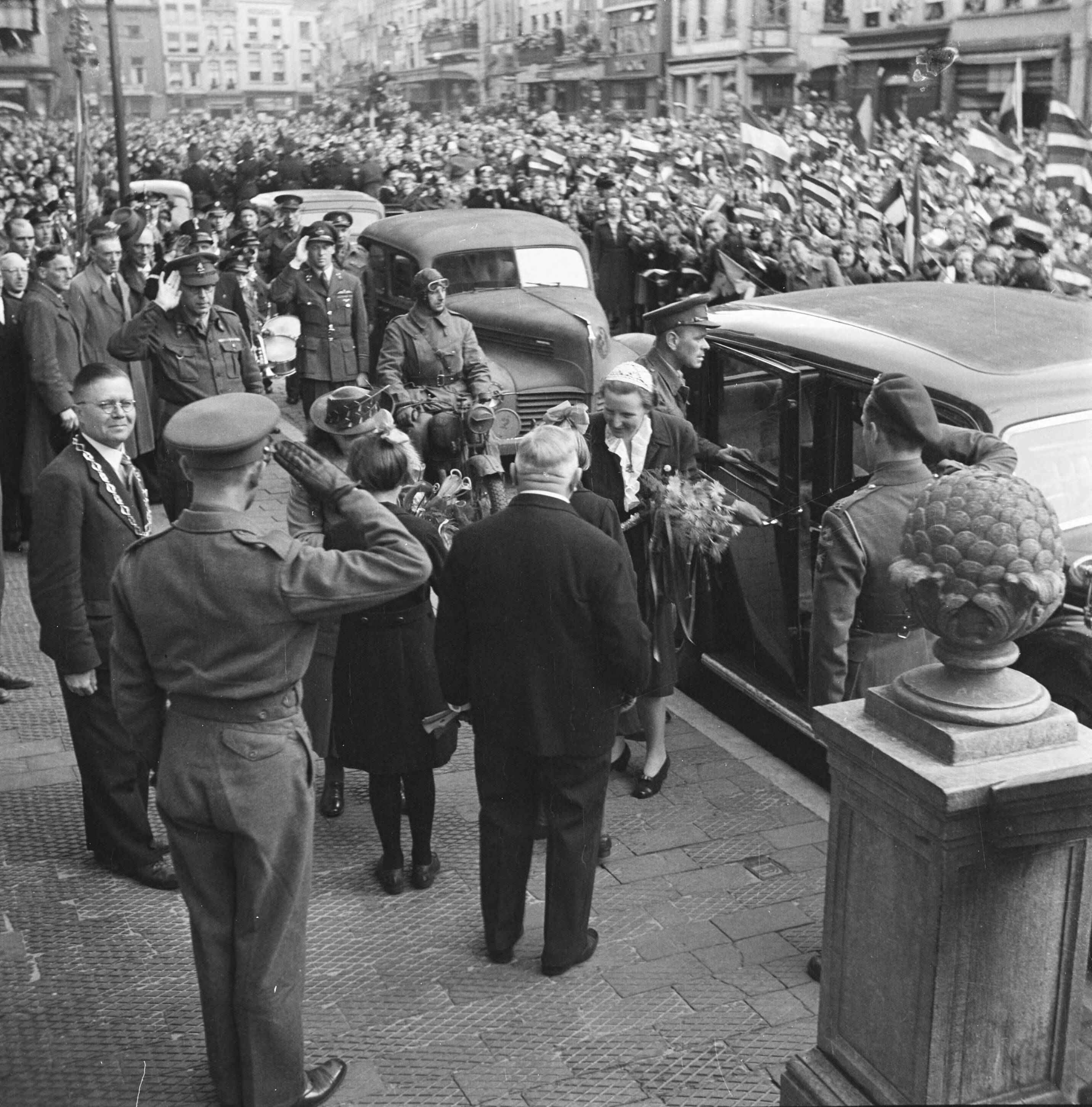 Bezoek van koningin Wilhelmina en prinses Juliana aan Breda. Ontvangst door waarnemend burgemeester Van Mierlo