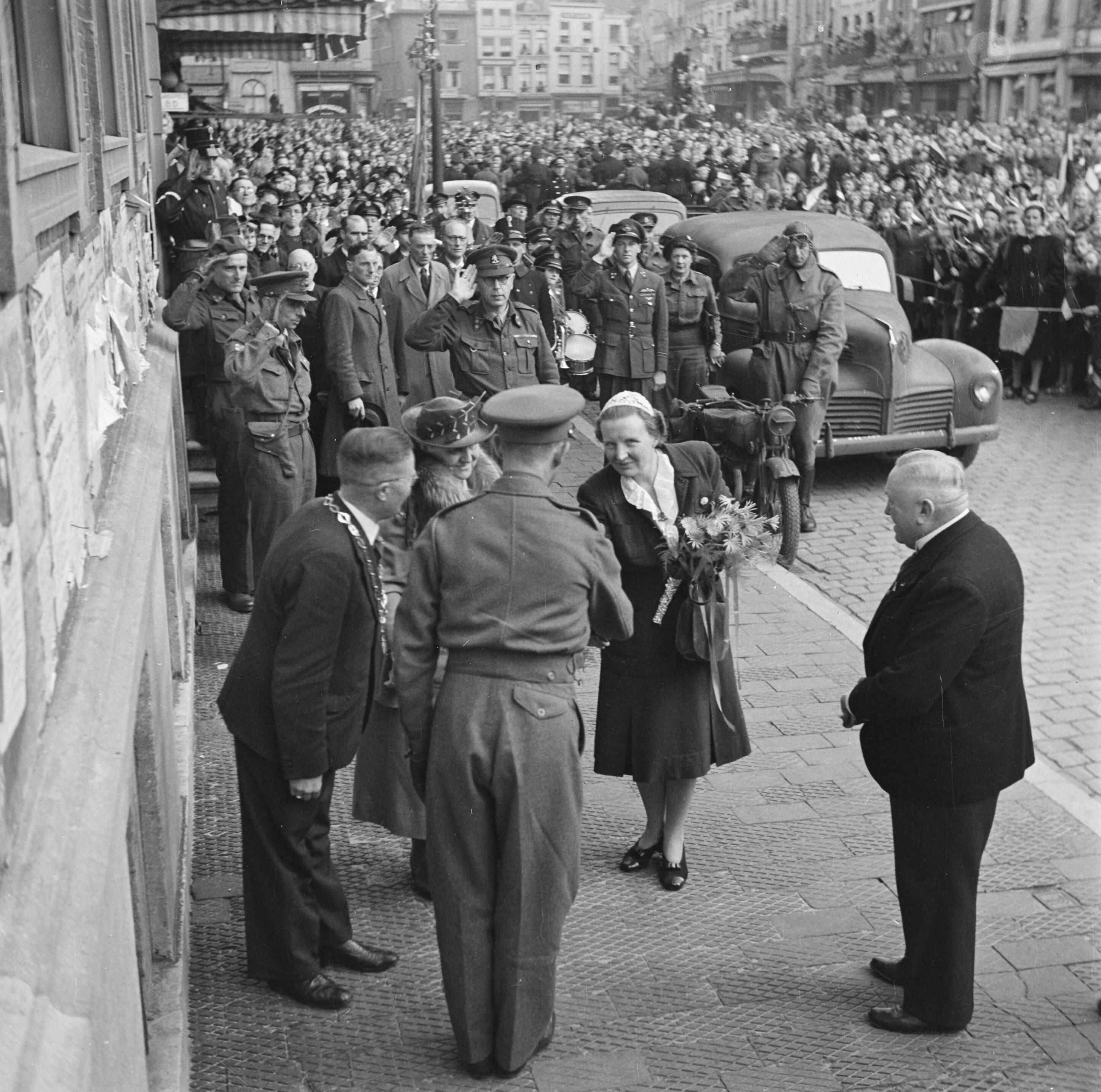 Bezoek van koningin Wilhelmina en prinses Juliana aan Breda. Ontvangst door waarnemend burgemeester Van Mierlo