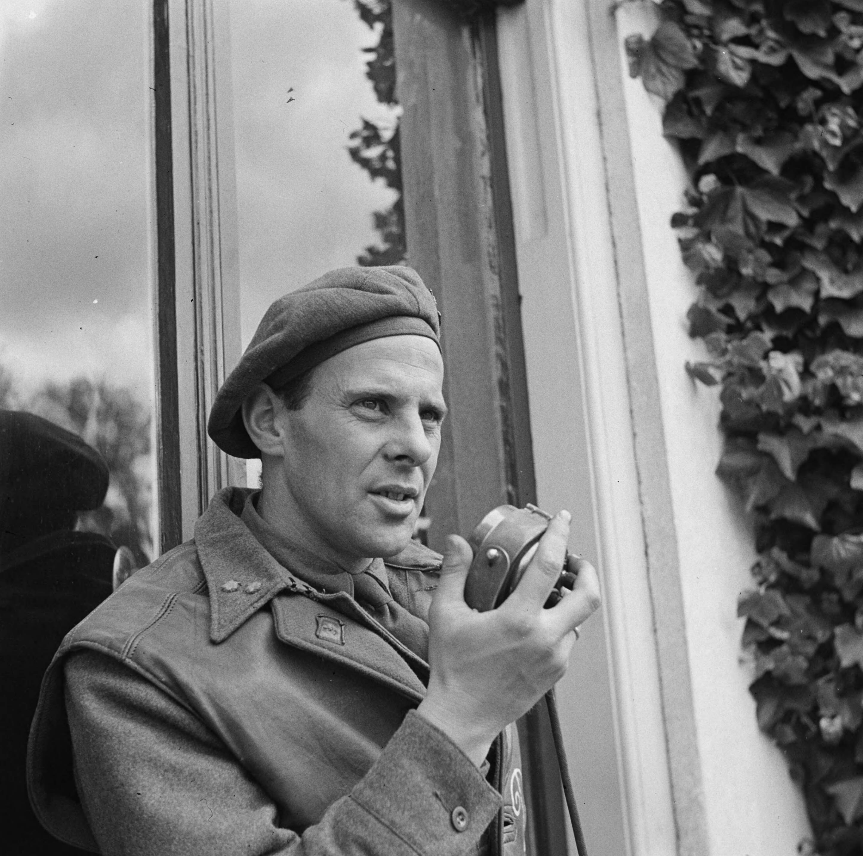 Voorbereidingen en onderhandelingen tot de capitulatie in Wageningen. Oorlogsverslaggever geeft zijn bevindingen door per radiomicrofoon (Het Loo, Apeldoorn)