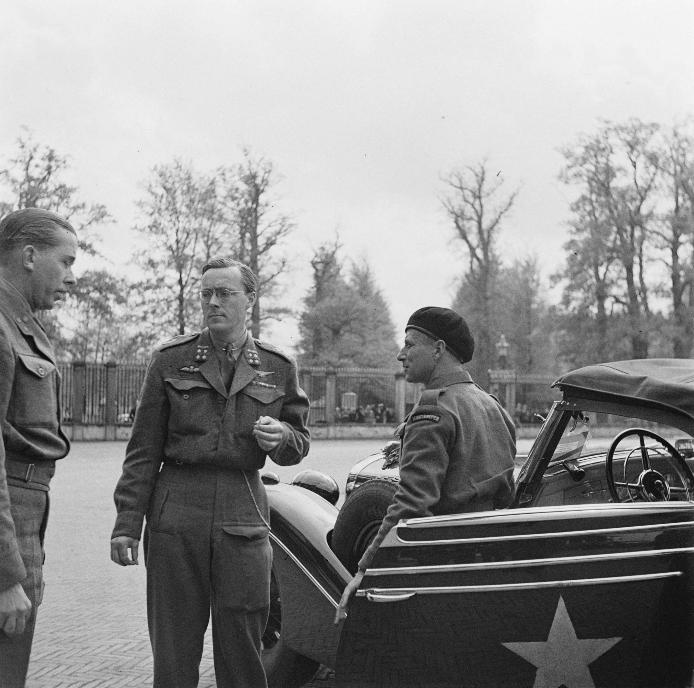 Voorbereidingen en onderhandelingen tot de capitulatie in Wageningen. Prins Bernhard bij Paleis het Loo te Apeldoorn