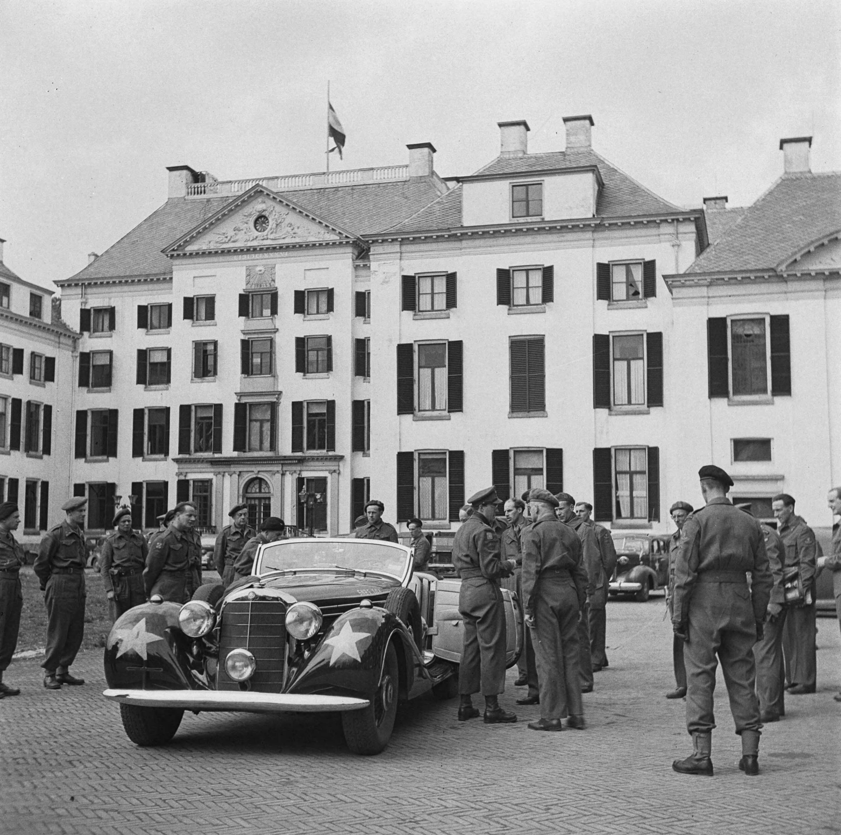 Voorbereidingen en onderhandelingen tot de capitulatie in Wageningen. Prins Bernhard bij Paleis het Loo te Apeldoorn, gereed voor vertrek naar Wageningen