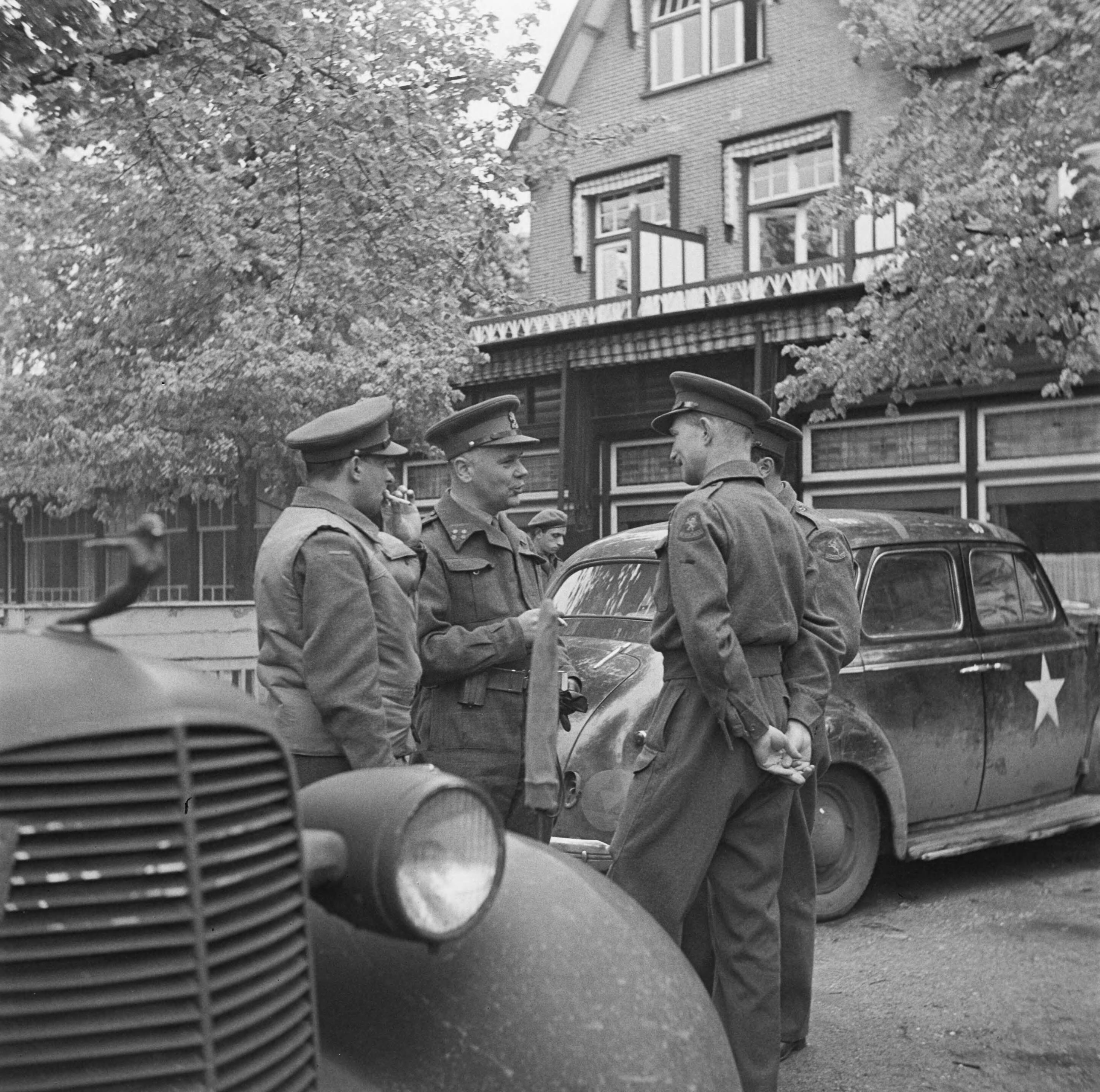 Het Militair Gezag op de Veluwe. In het midden generaal mr. H.J. Kruls, chef-staf van het M.G.