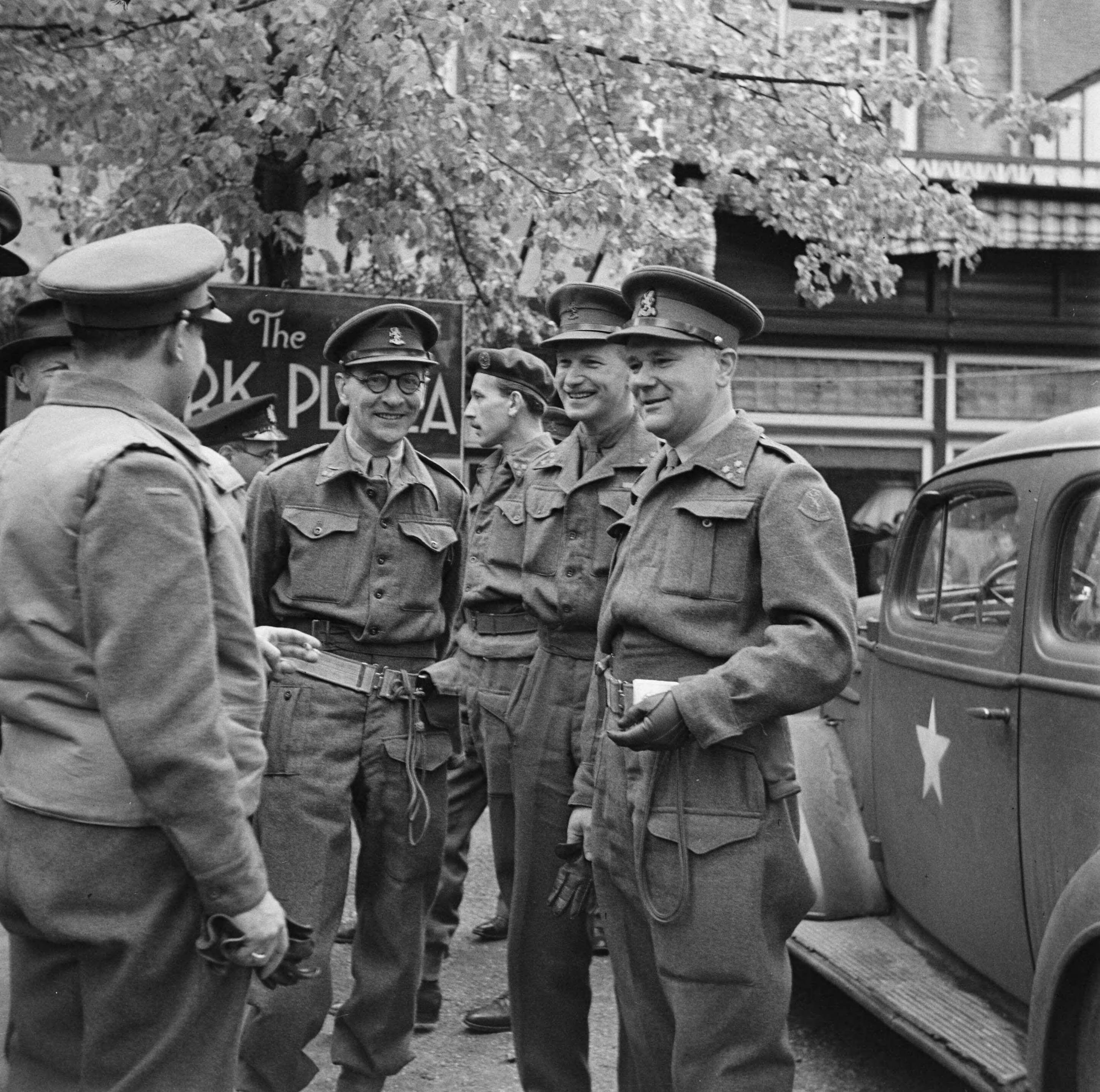 Het Militair Gezag op de Veluwe. De chef-staf van het M.G., Generaal mr. H.J. Kruls (2e van rechts) omringd door officieren.