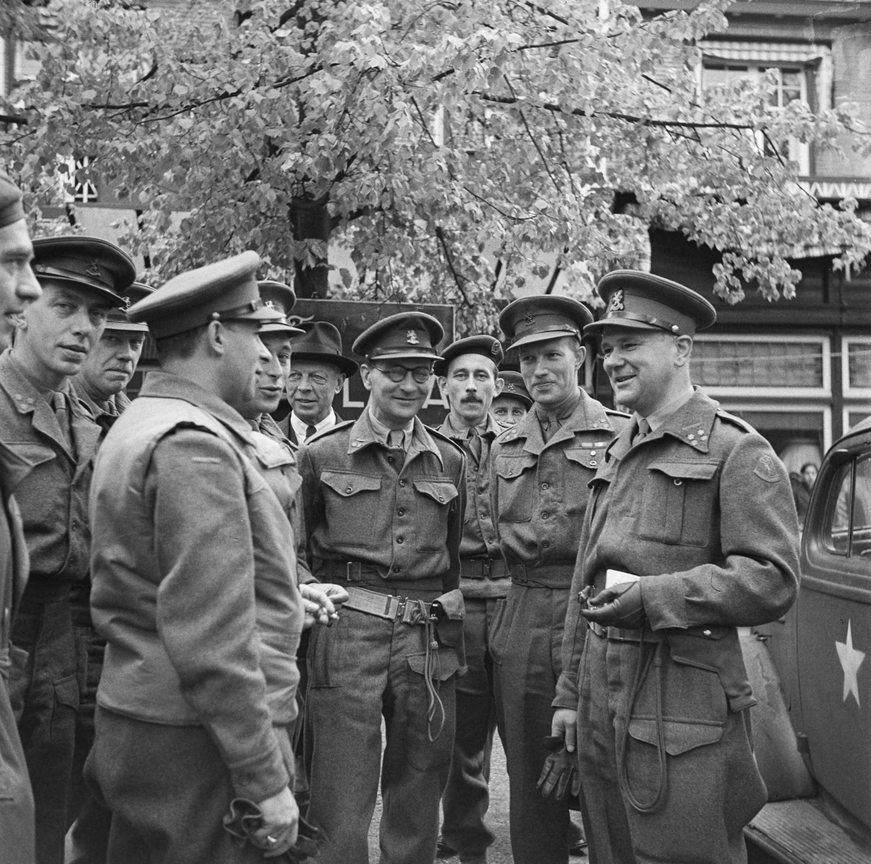Het Militair Gezag op de Veluwe. De chef-staf van het M.G., Generaal mr. H.J. Kruls (2e van rechts) omringd door officieren.