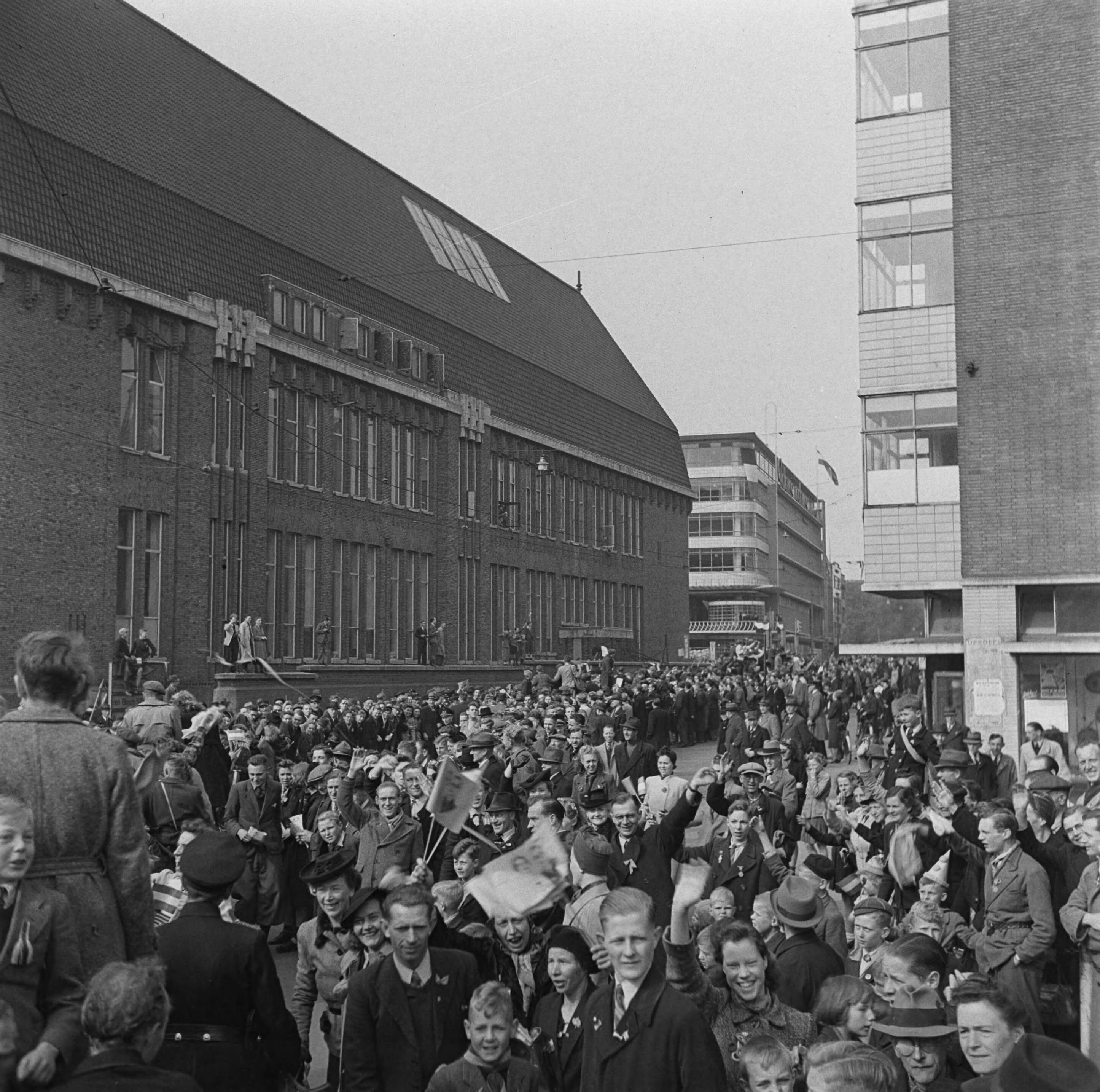 Een uitzinnige menigte verwelkomt de Geallieerden (49e Britse infanterie divisie komend vanaf Lunteren) bij hun intocht in Utrecht op de Neude
