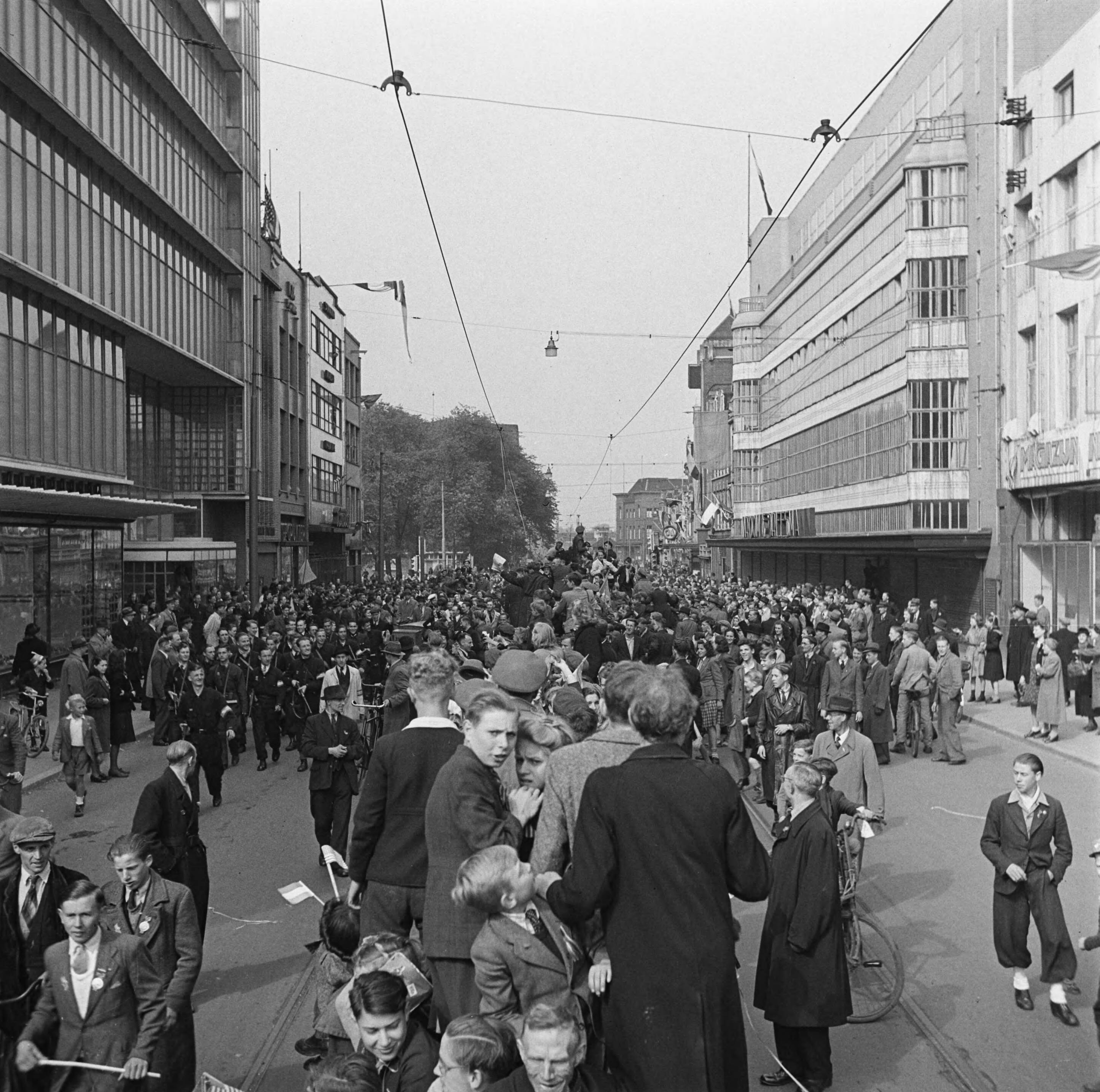Een uitzinnige menigte verwelkomt de Geallieerden (49e Britse infanterie divisie komend vanaf Lunteren) bij hun intocht in Utrecht in de Viestraat