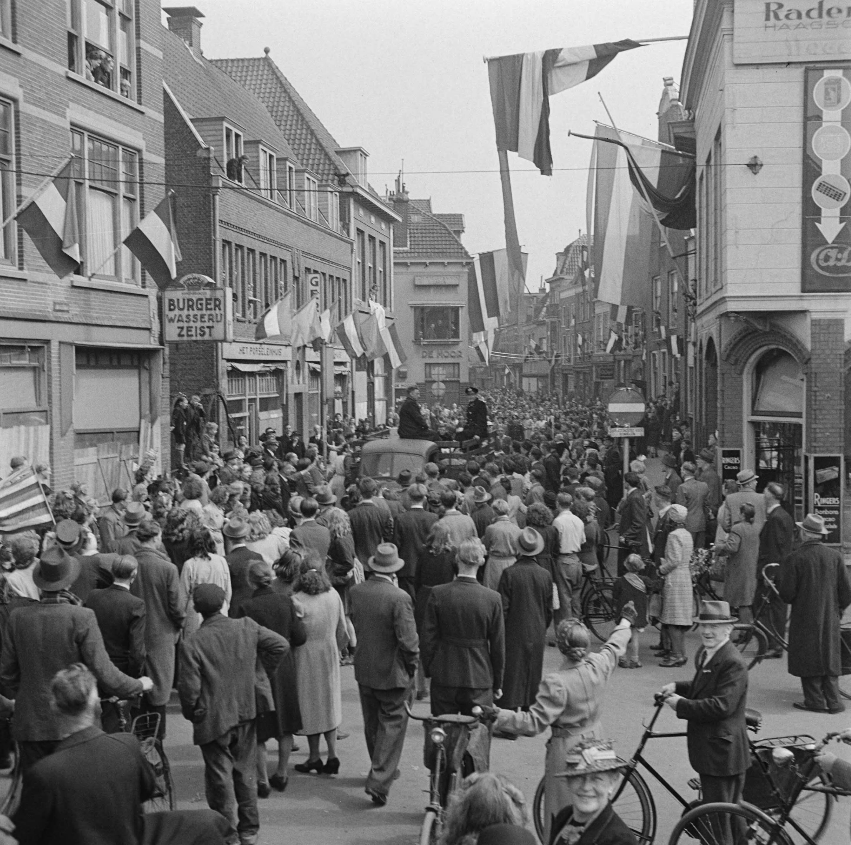 Een uitzinnige menigte verwelkomt de Geallieerden (49e Canadese infanterie divisie) bij hun intocht in de Langestraat in Amersfoort.