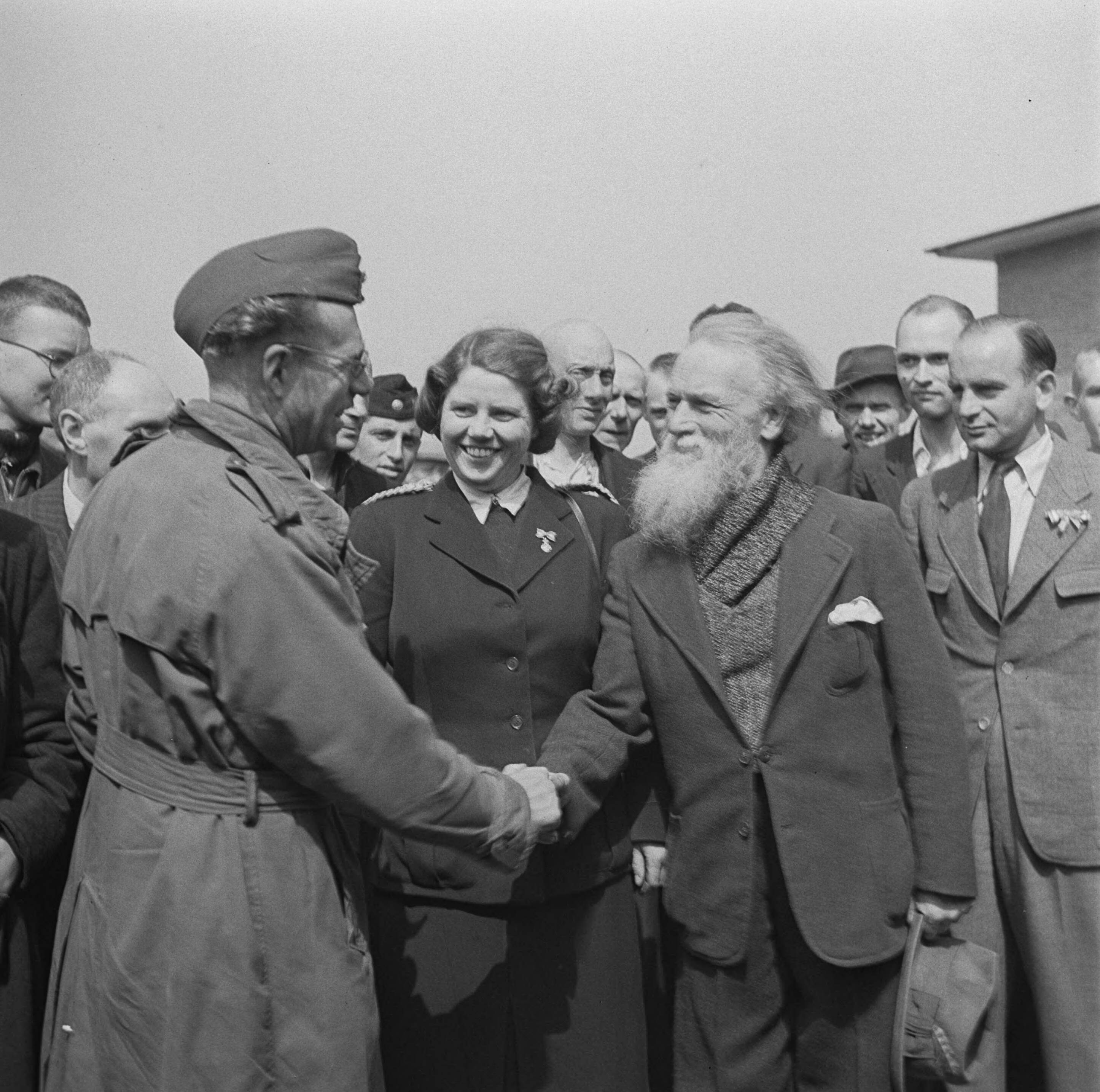 Bevrijding van het concentratiekamp te Amersfoort. Een gevangene begroet een Canadese officier