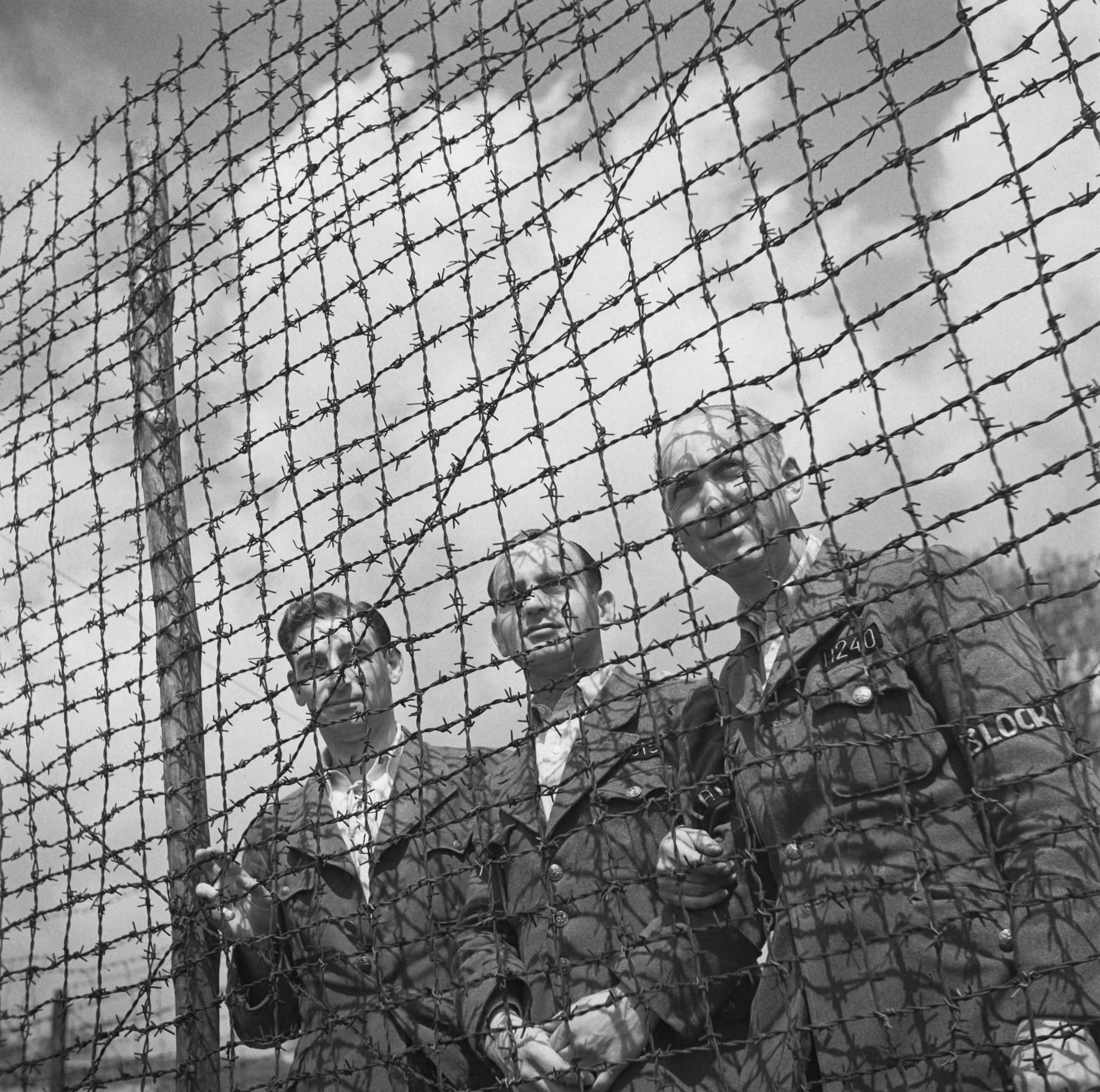 Bevrijding van het concentratiekamp te Amersfoort. Drie Nederlandse officieren achter het prikkeldraad de rechtse persoon draag het nummer 1240 en een armband "block..."