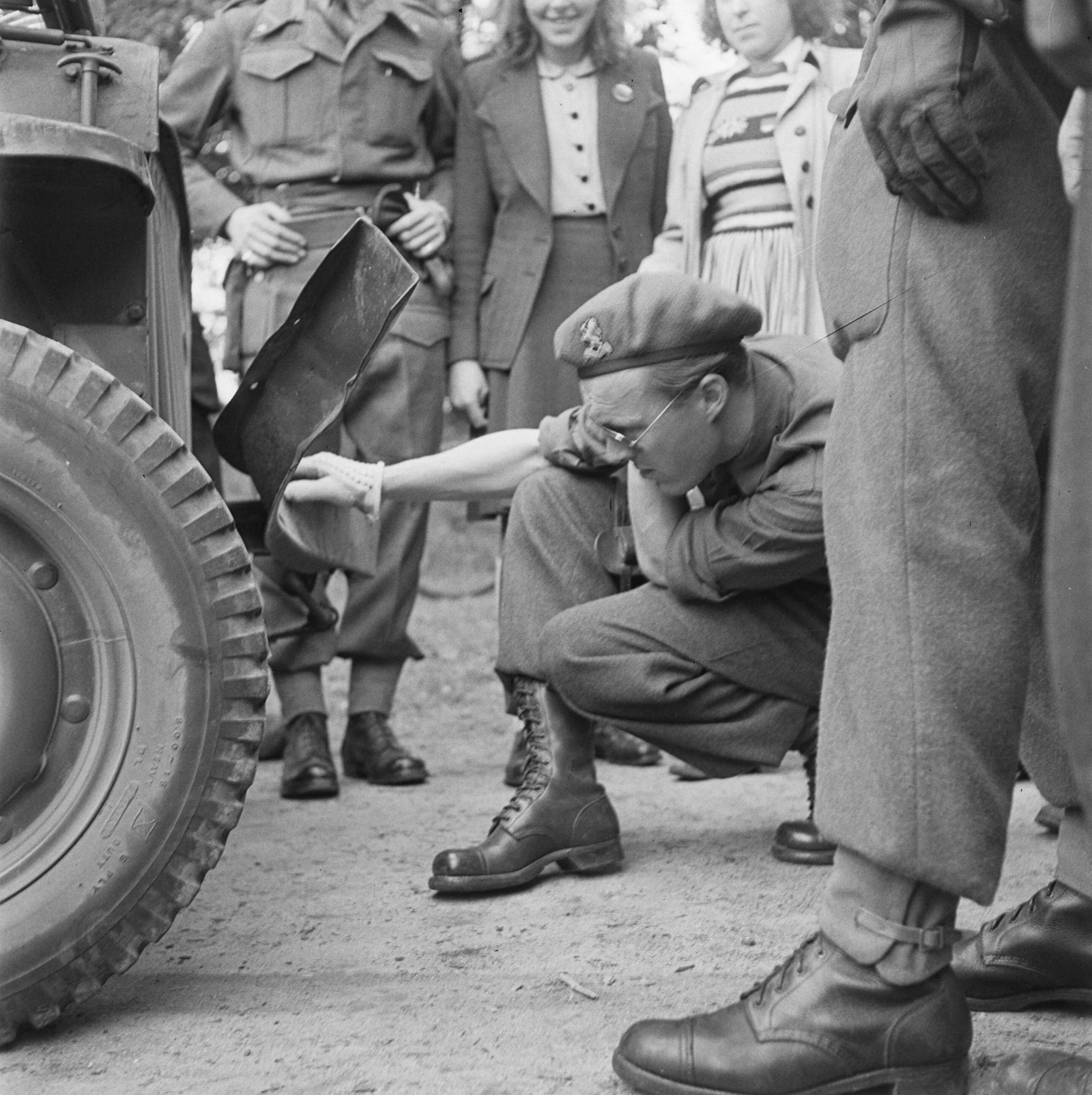 Prins Bernhard bij zijn jeep na een aanrijding.