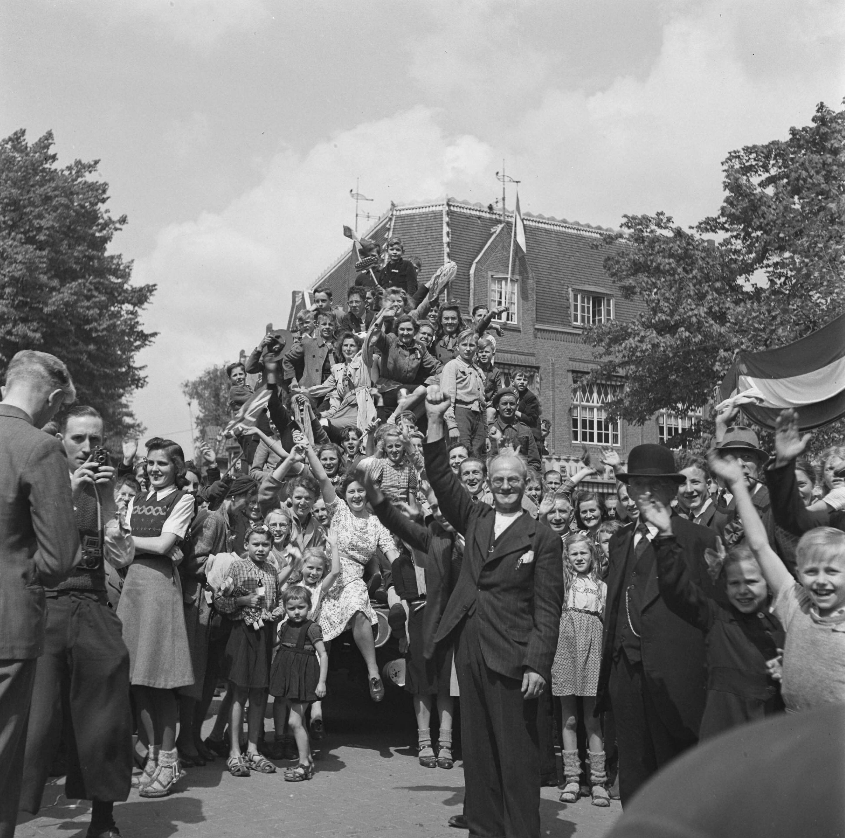 Vreugde in Hilversum. Een geallieerd legervoertuig bedolven onder toeschouwers.
