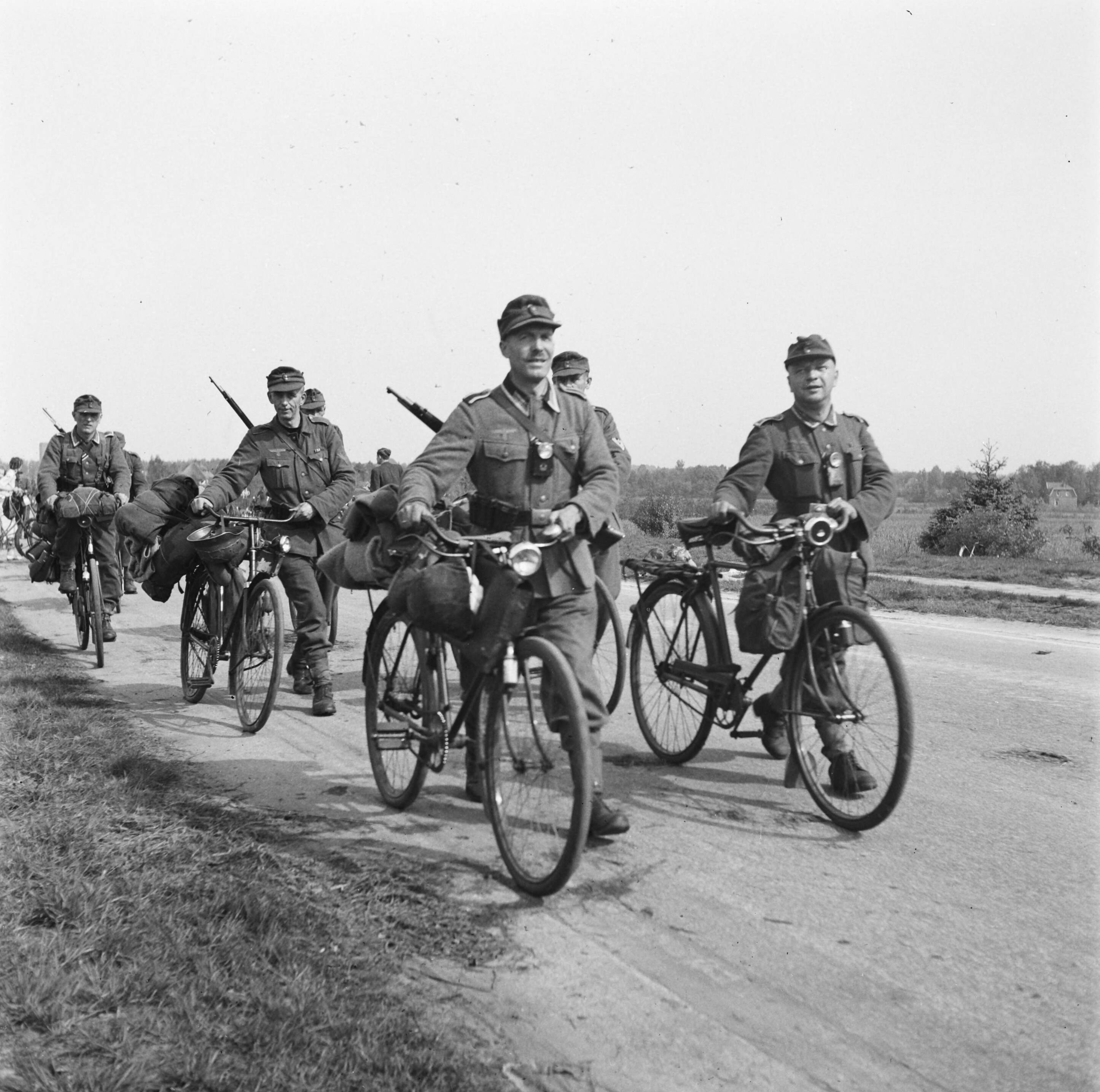 Duitser trekken na de capitulatie uit het Gooi weg. Rijdend op of lopend naast hun fietsen gaan zij hun wapens en uitrusting inleveren.