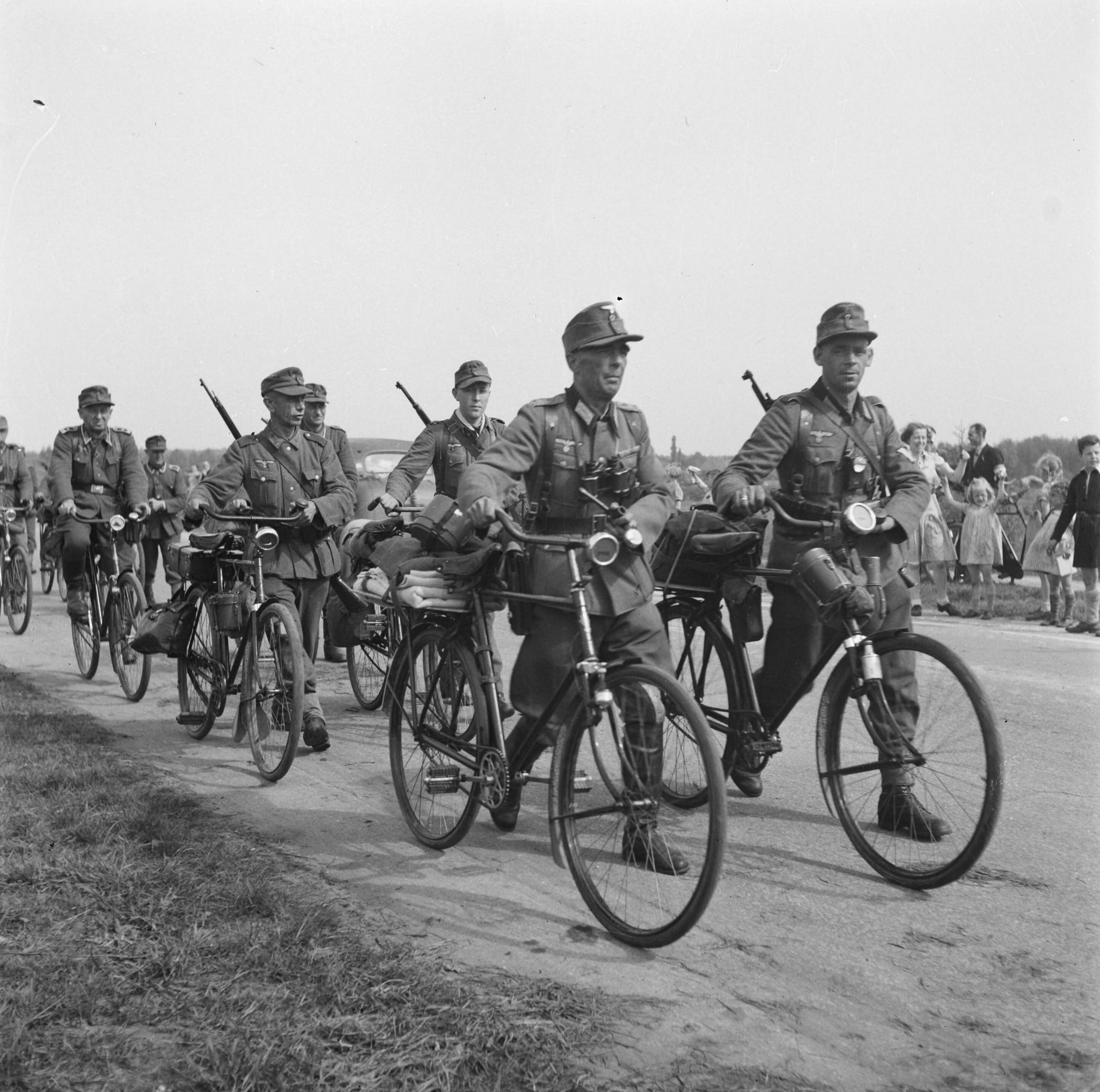 Lopend naast hun fietsen gaan zij hun wapens en uitrusting inleveren.
