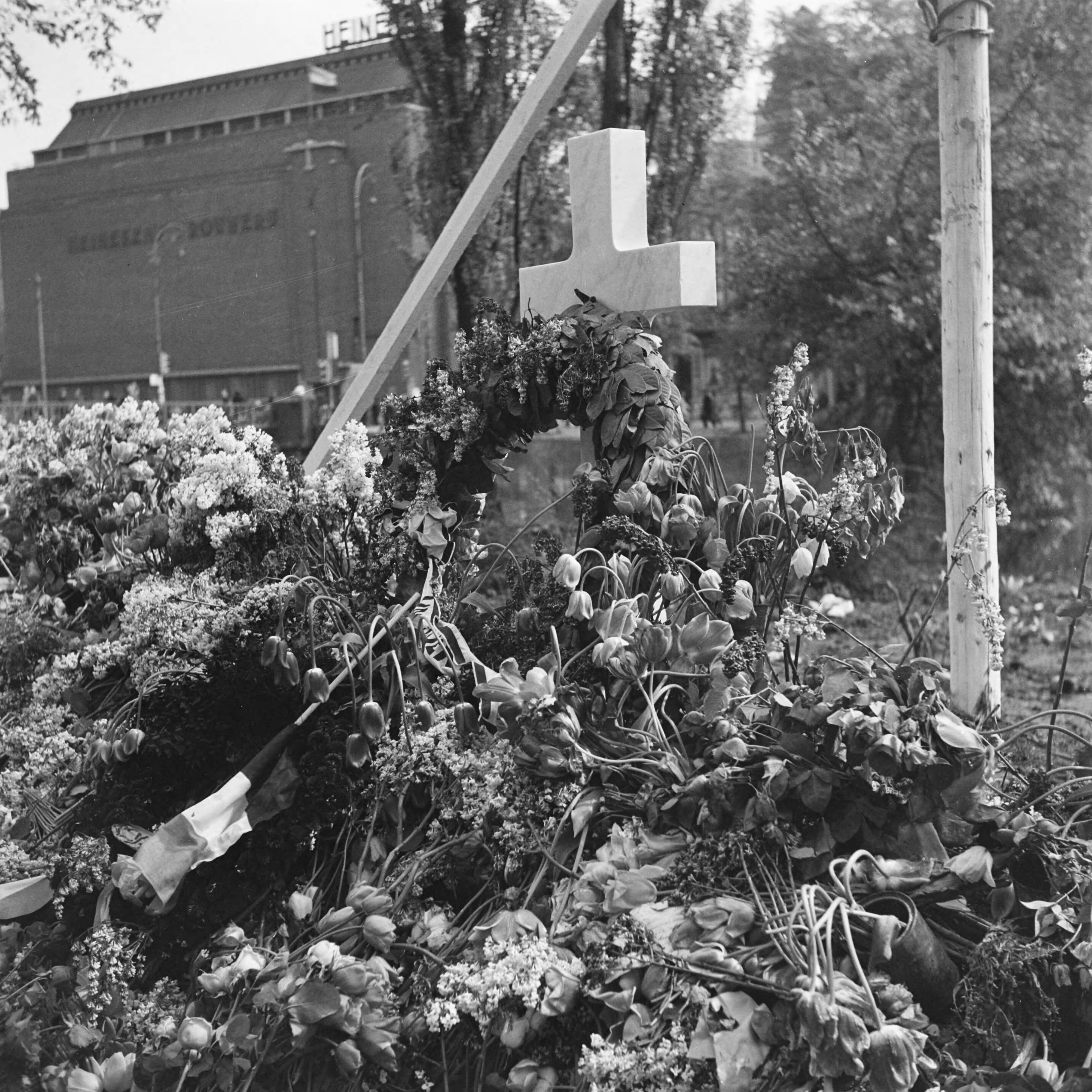 Kruis omringd door kransen en bloemen in het Weteringplantsoen te Amsterdam waar op 12 maart 1945 dertig verzetsstrijders door de Duitsers gefusilleerd werden