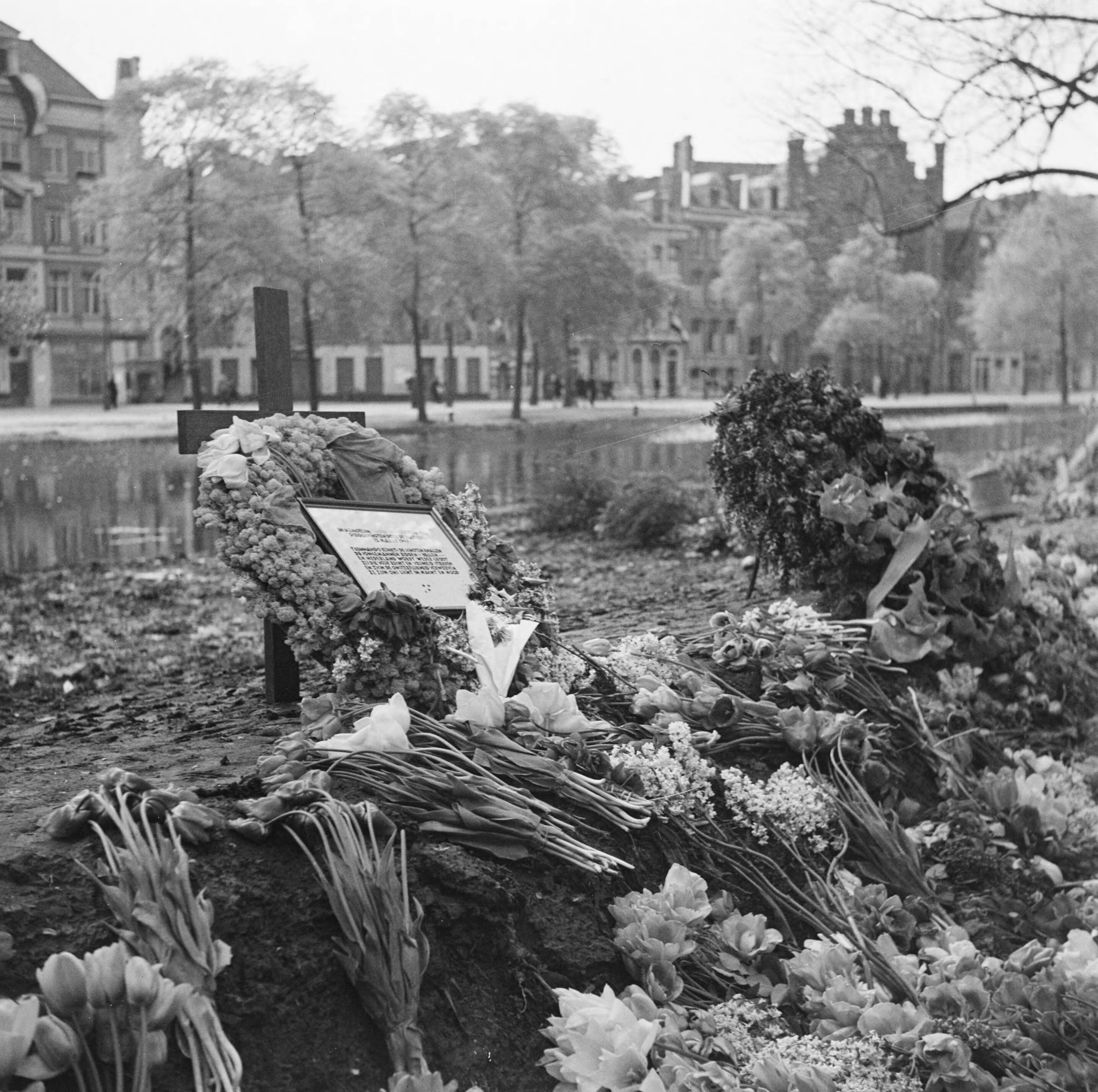 Bloemen en kransen in het Weteringplantsoen te Amsterdam waar op 12 maart 1945 dertig verzetsstrijders door de Duitsers werden gefusilleerd